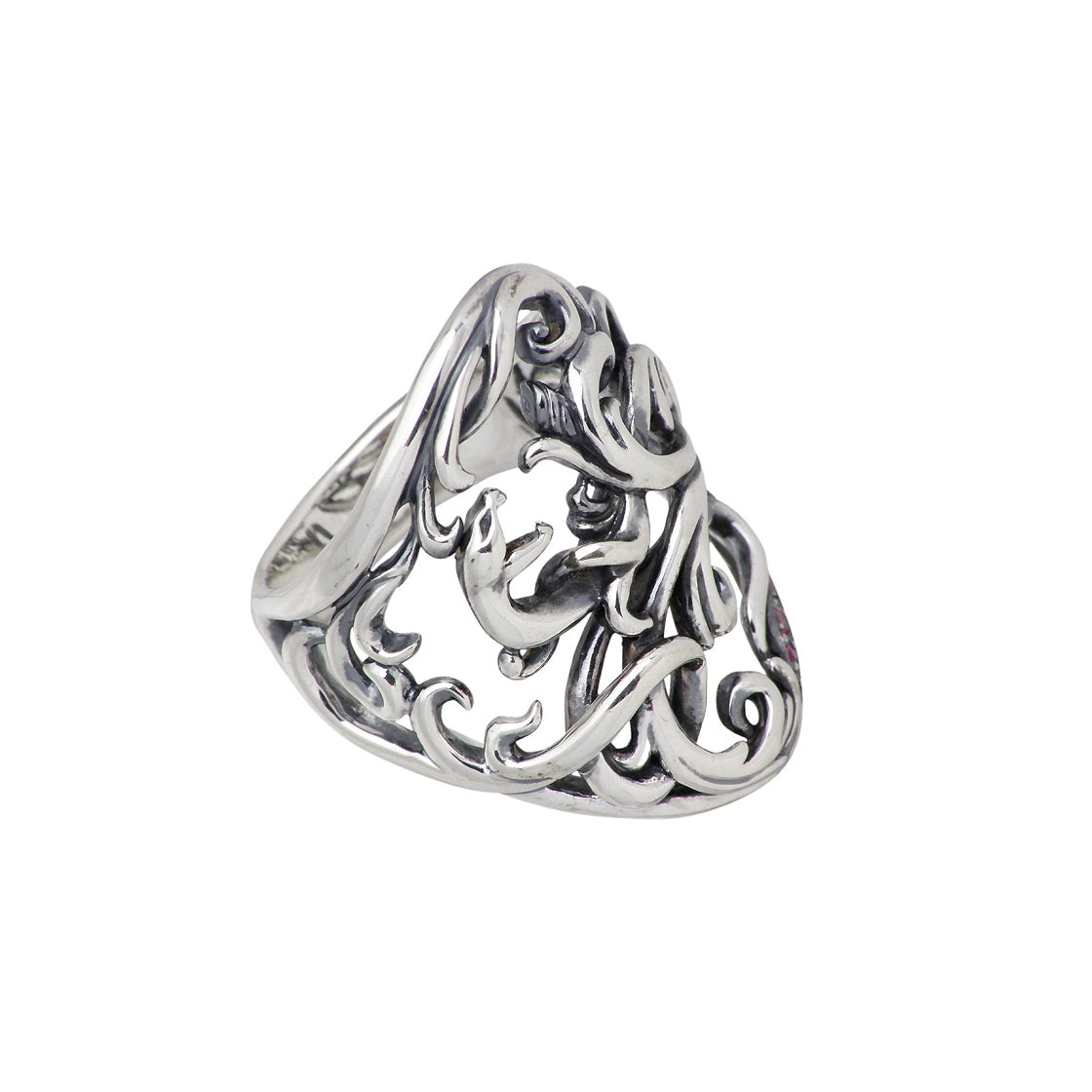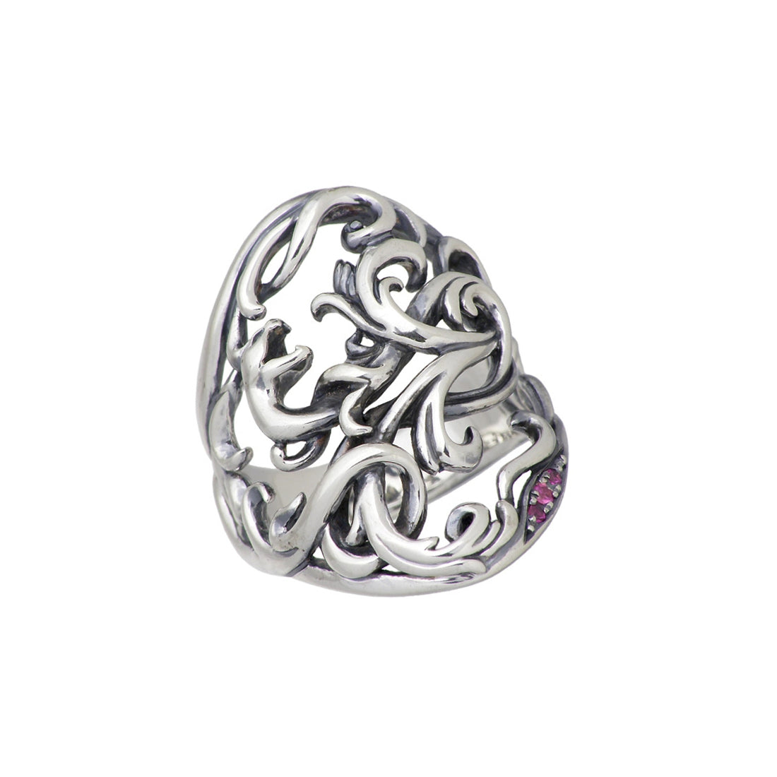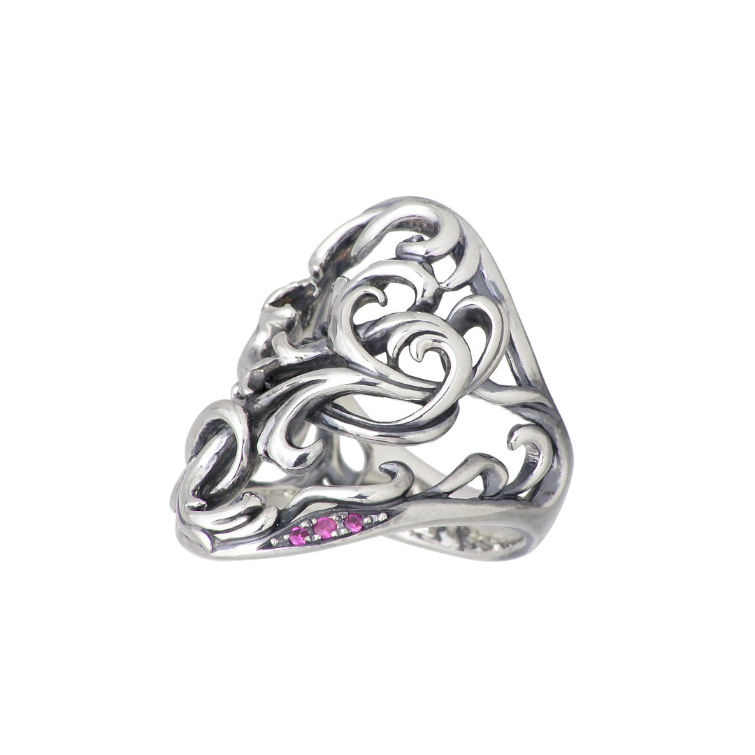 具象=蛇が獲物を捕える前に身を潜める静けさや勢いよく飛びかかる空気を、曲線美を用いて表現したリング。画像は「合成ルビー」を使用。