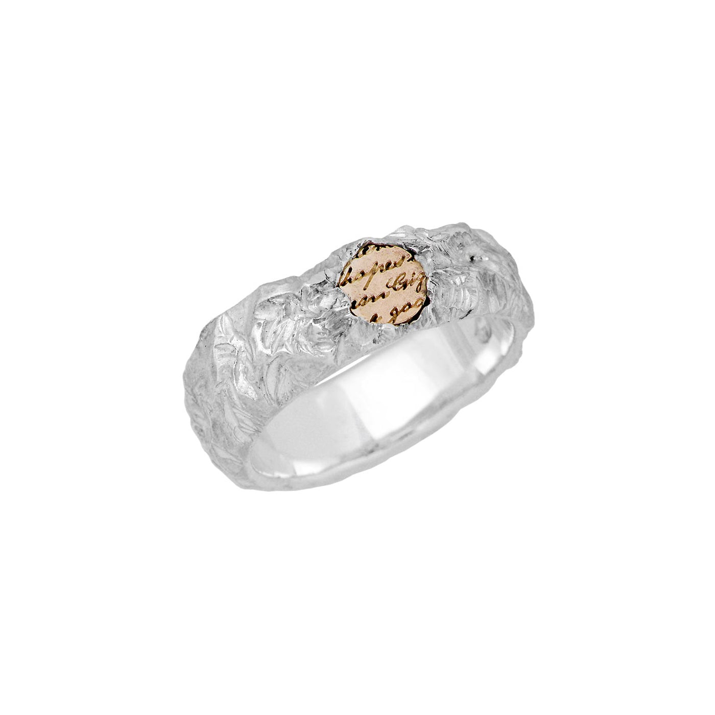 ヤジリに使われていた黒曜石が割れた瞬間、金の石盤が現れたかのように表現したリング。