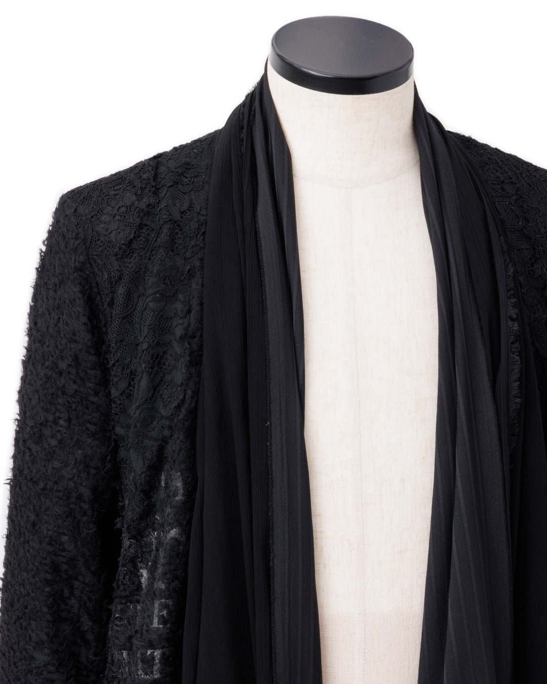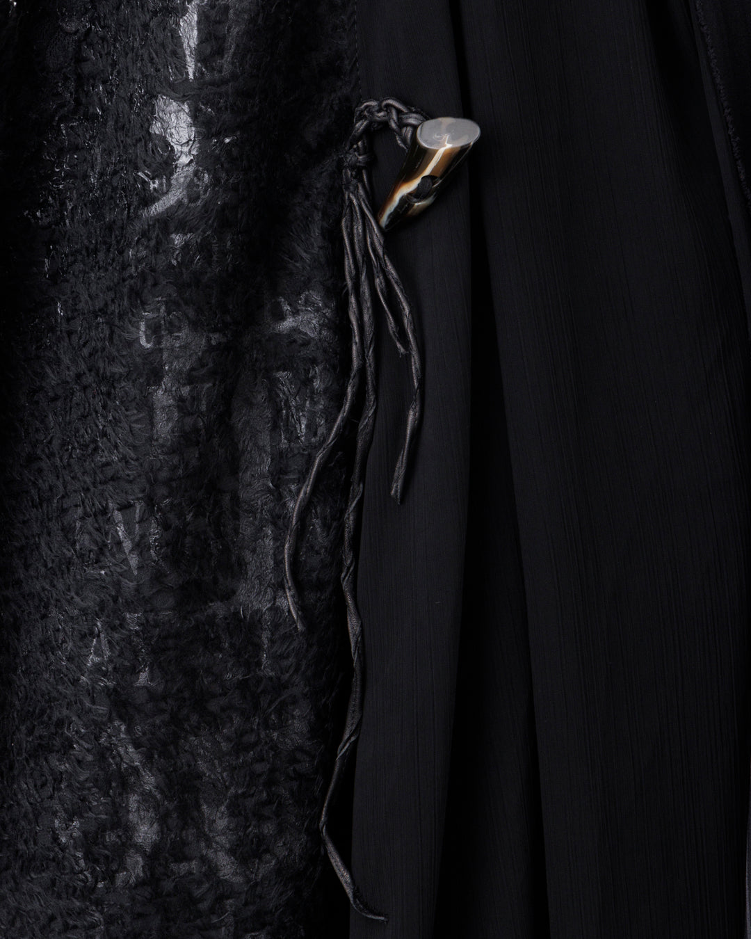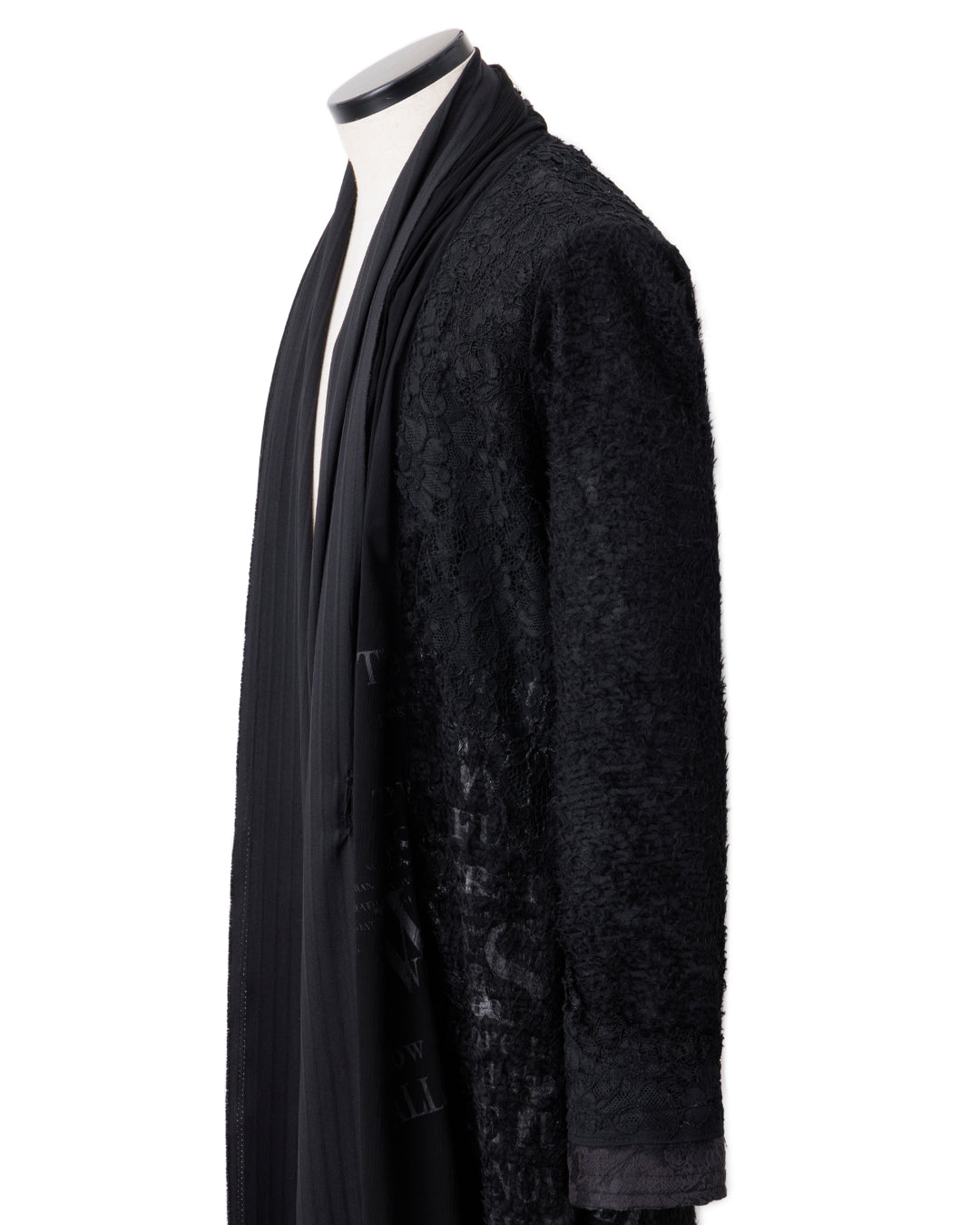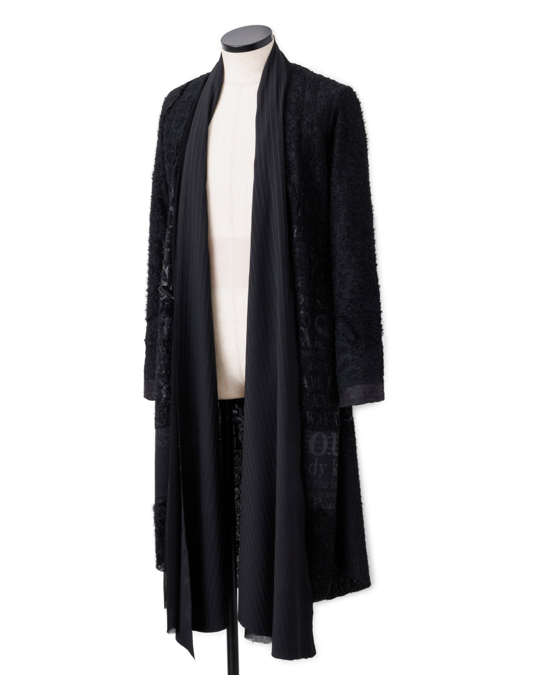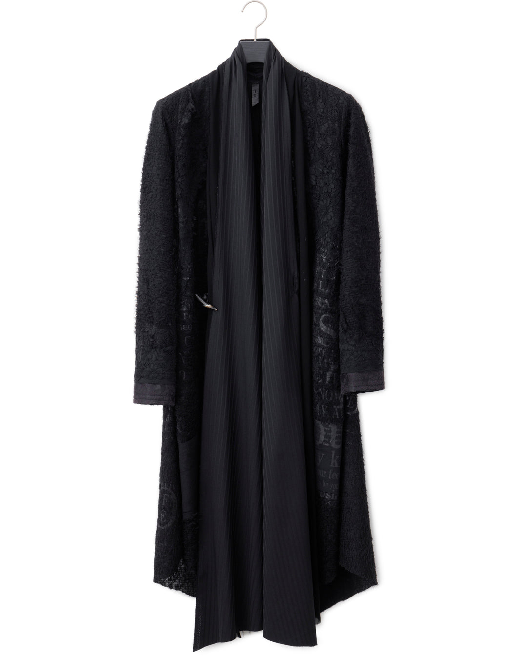 フロントはさらに2種類の黒生地、オーガンジーとシャドーストライプをアレンジ。トグルにレザーの編み紐などのディテールで、東洋の文化の美しさを西洋の宗教着にあるような解釈でリアレンジし、モード的なデザインに再構築しています。黒で統一することでロックさを加味した、非常に凝った作品です。」
