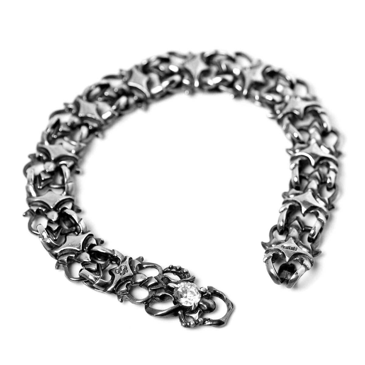 まるでオーパーツのような表情を見せるブレスレット。パーツひとつひとつを密に連結させ、フック部分にはジルコニアを配置。重厚な見た目ながら極めて軽い装着感を得られ、高低差なく手首にフィットするブレスレットです。