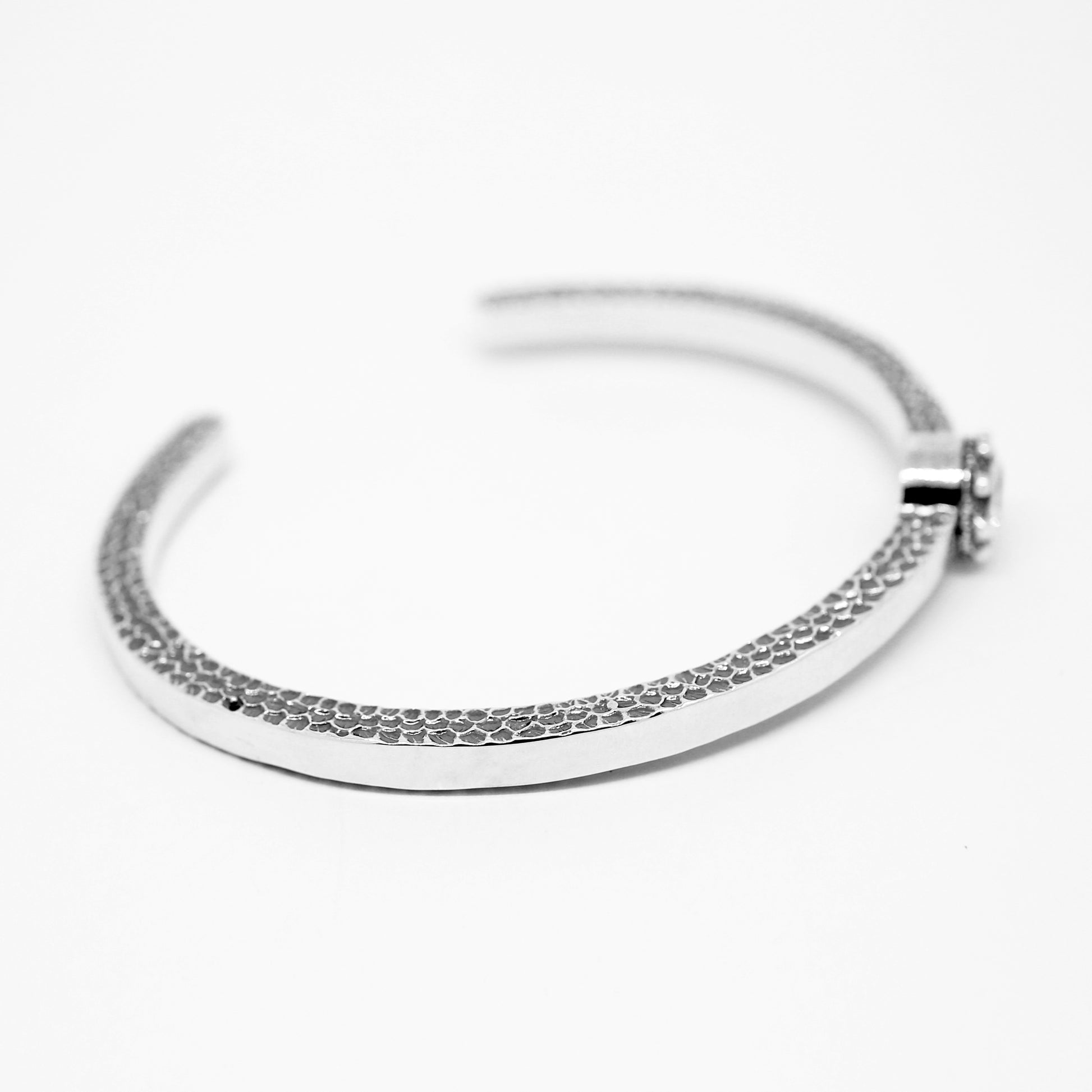 テクスチャーと鏡面のコントラストを特徴に、正面から少しズラした位置にセットしたジルコニアがポイントのアクセントになるバングルです。