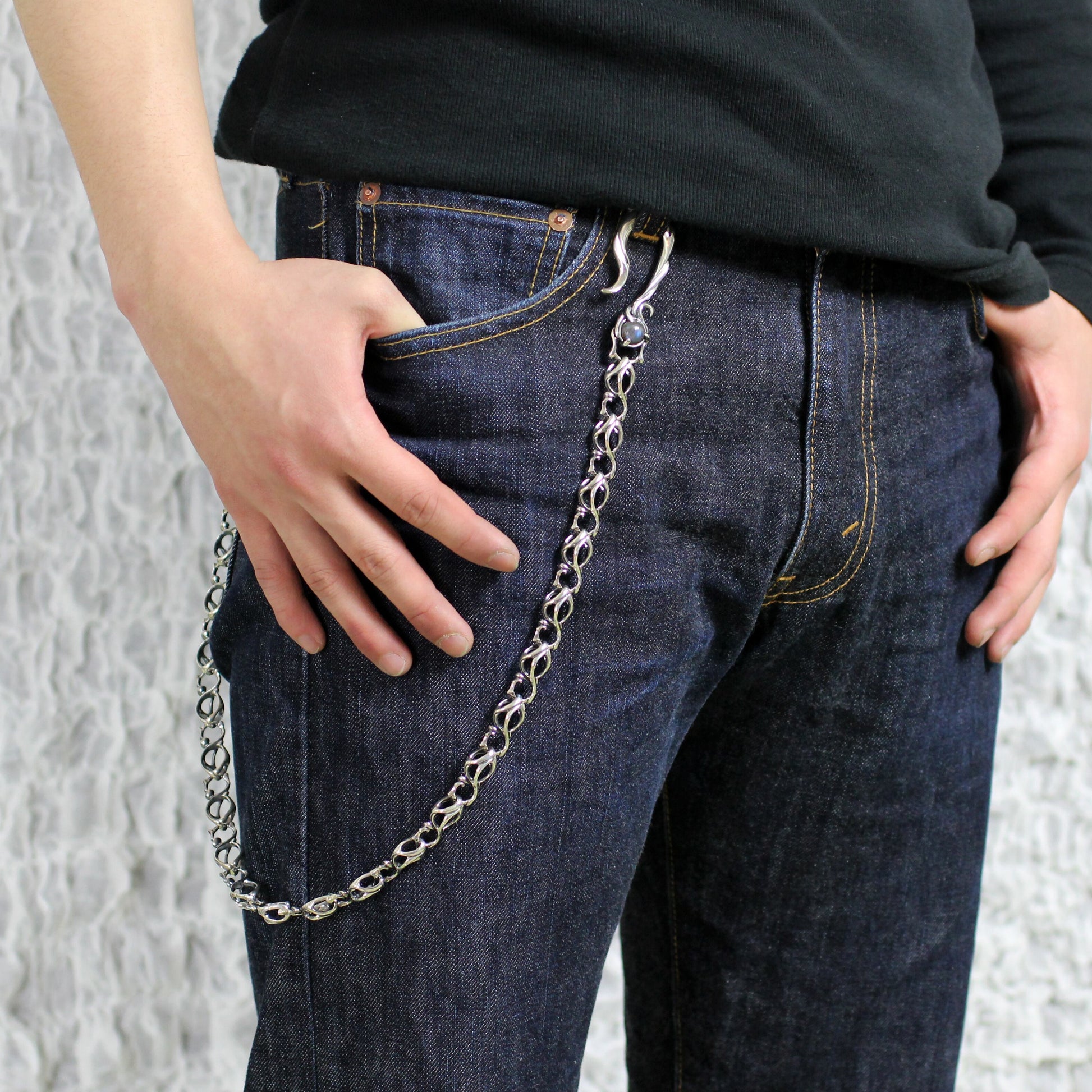 立体的なラインと透かしによって軽量に仕上げつつ、しっかりとしたボリューム感を演出。スペクトロライトを爪で抱えたフック部分が印象的なウォレットチェーンです。