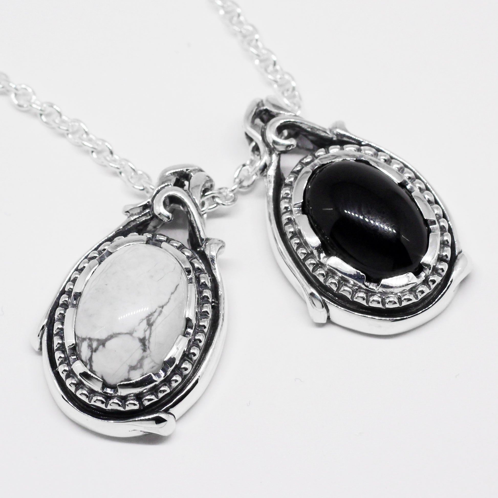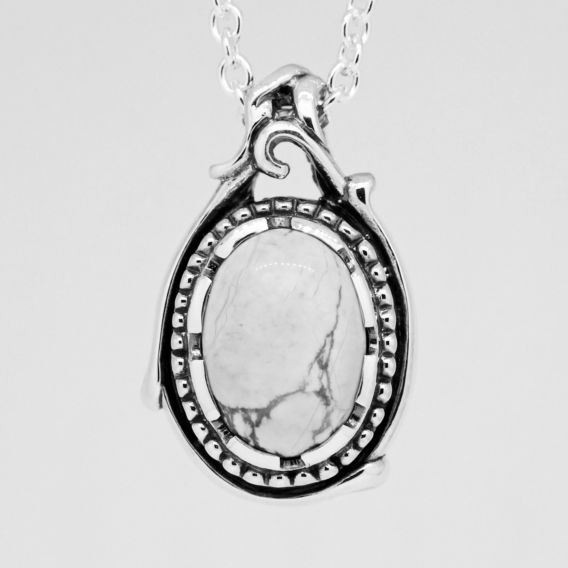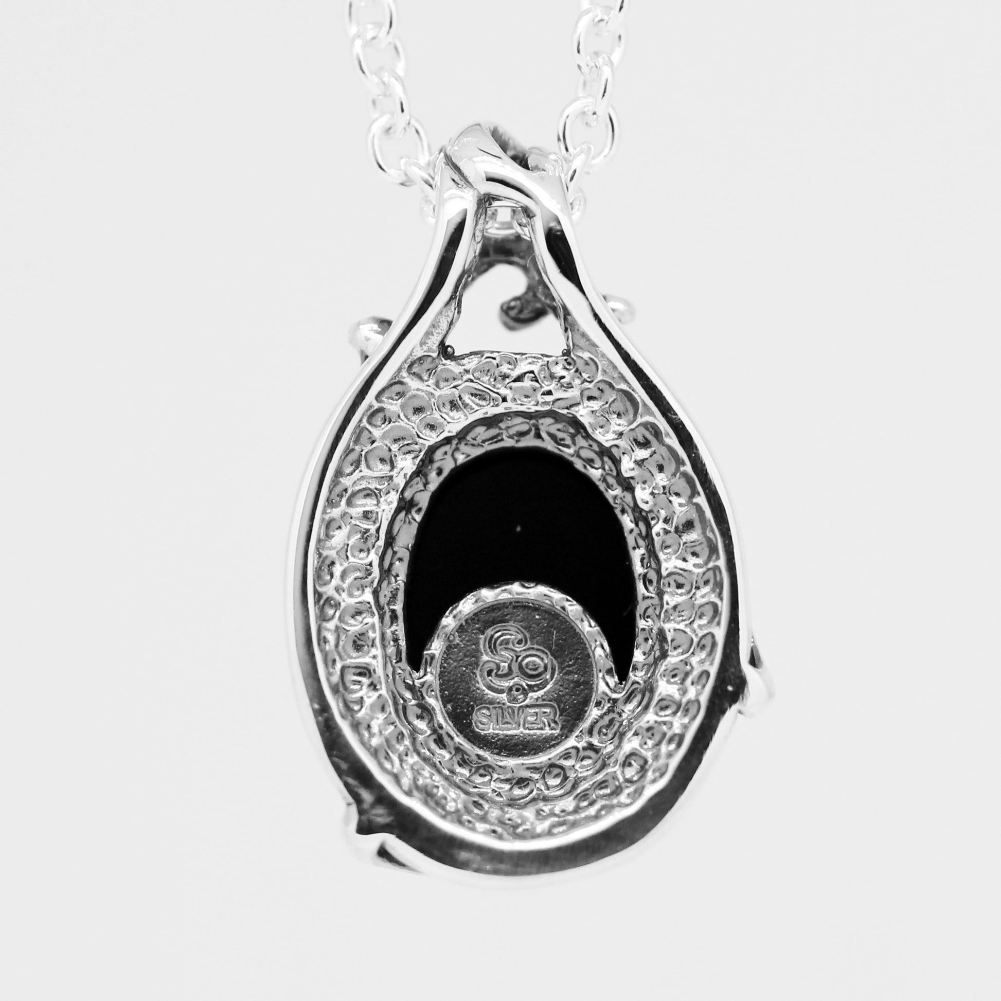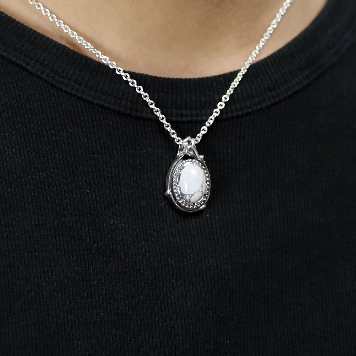 天然石を使用した規則的な構成の中で、曲線がバチカン部分で不規則に絡み合うペンダント。
