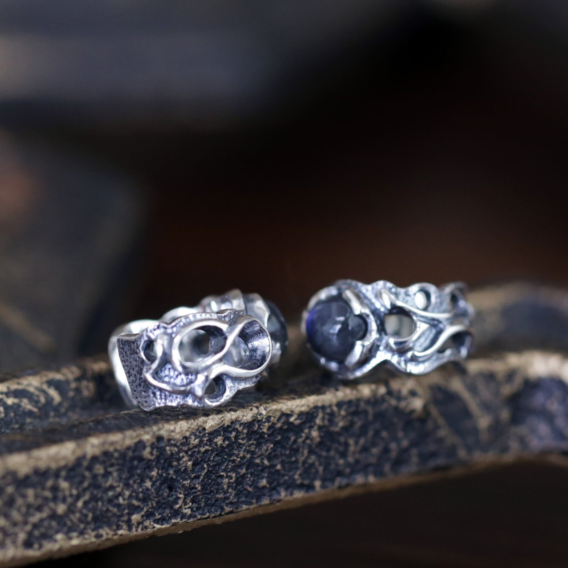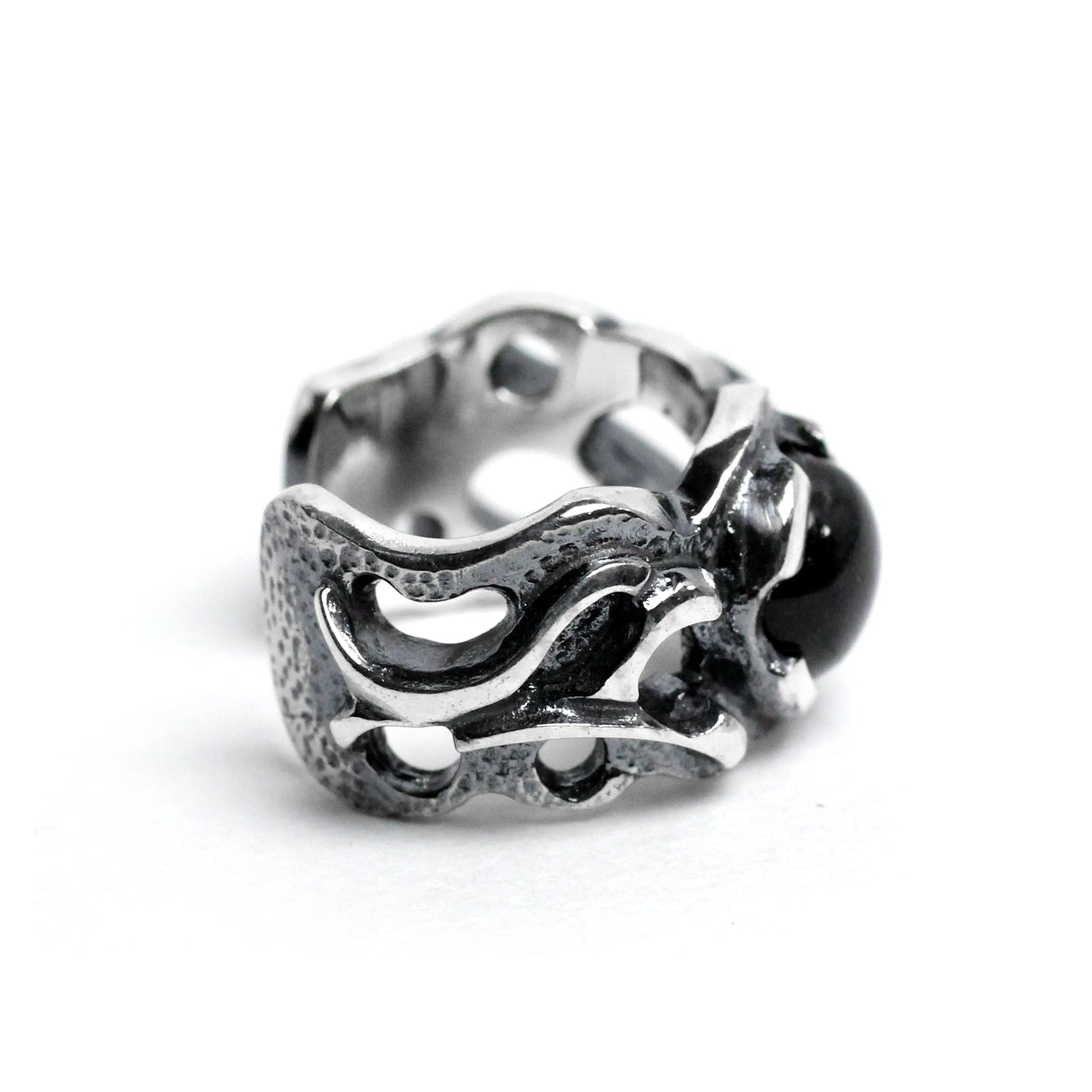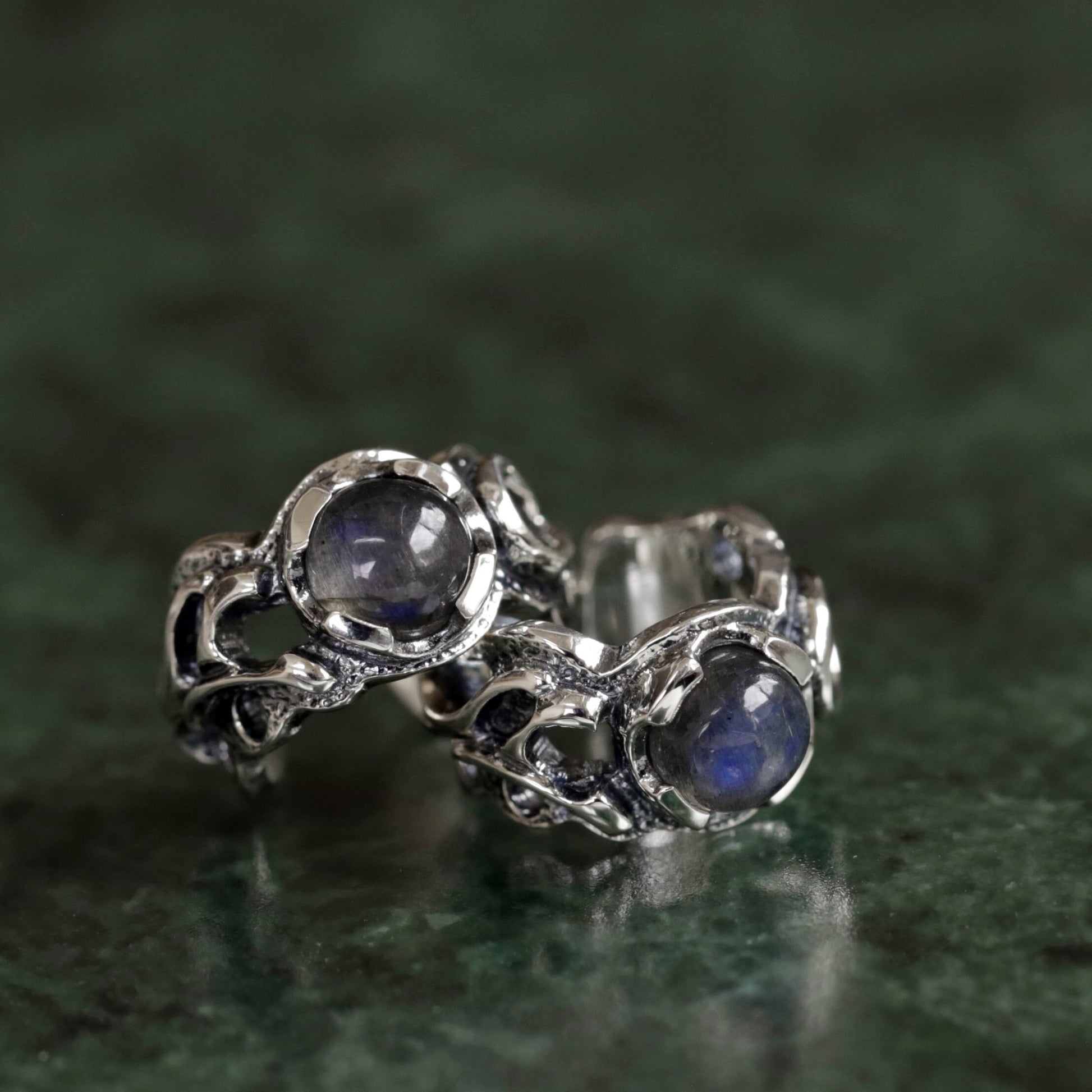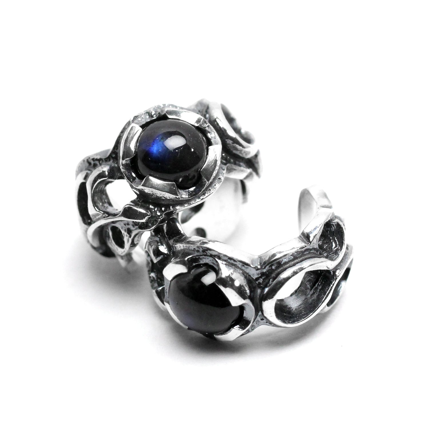 スペクトロライトの潤いのある輝きを、エッジの効いた曲線と透かしで引き立てたイヤカフス。