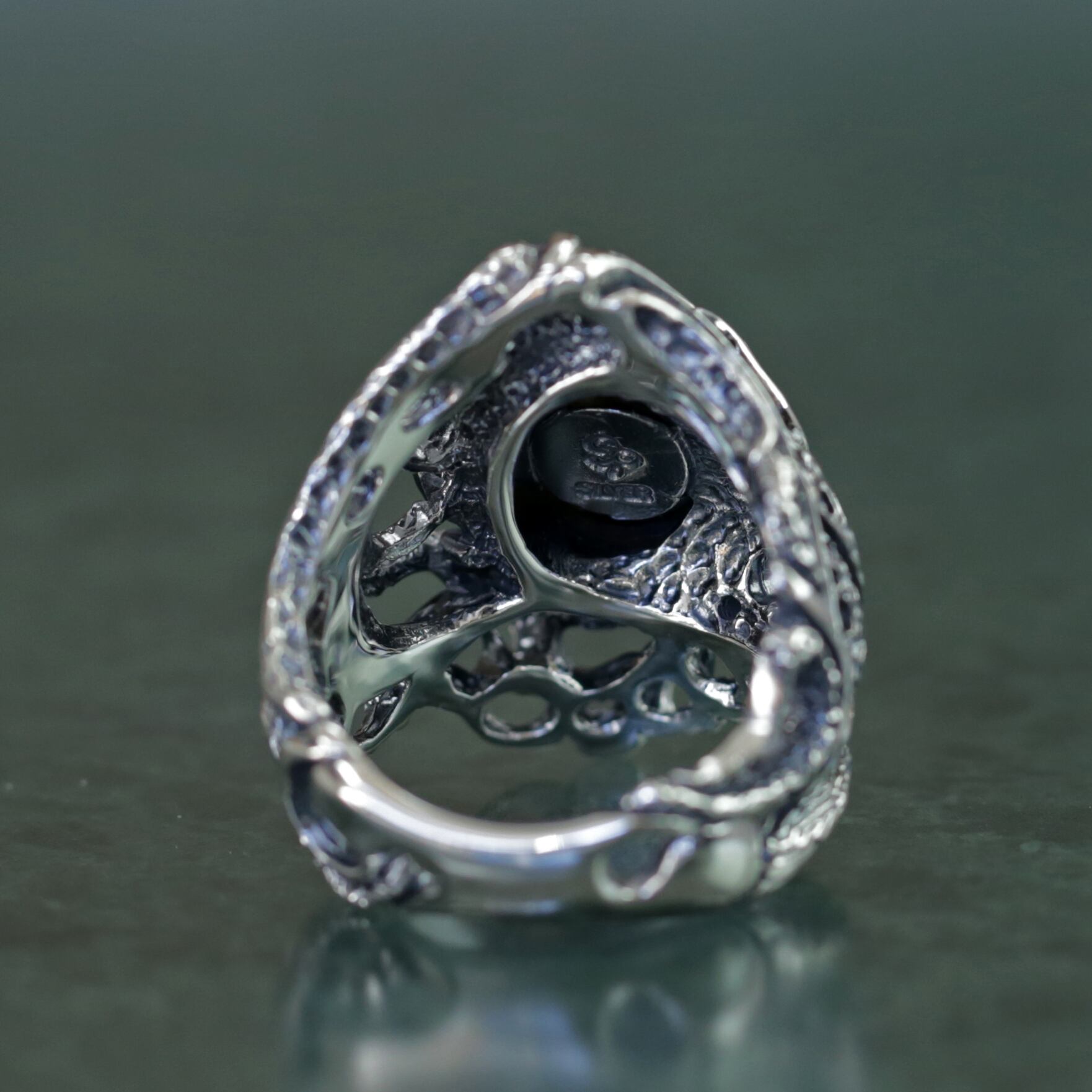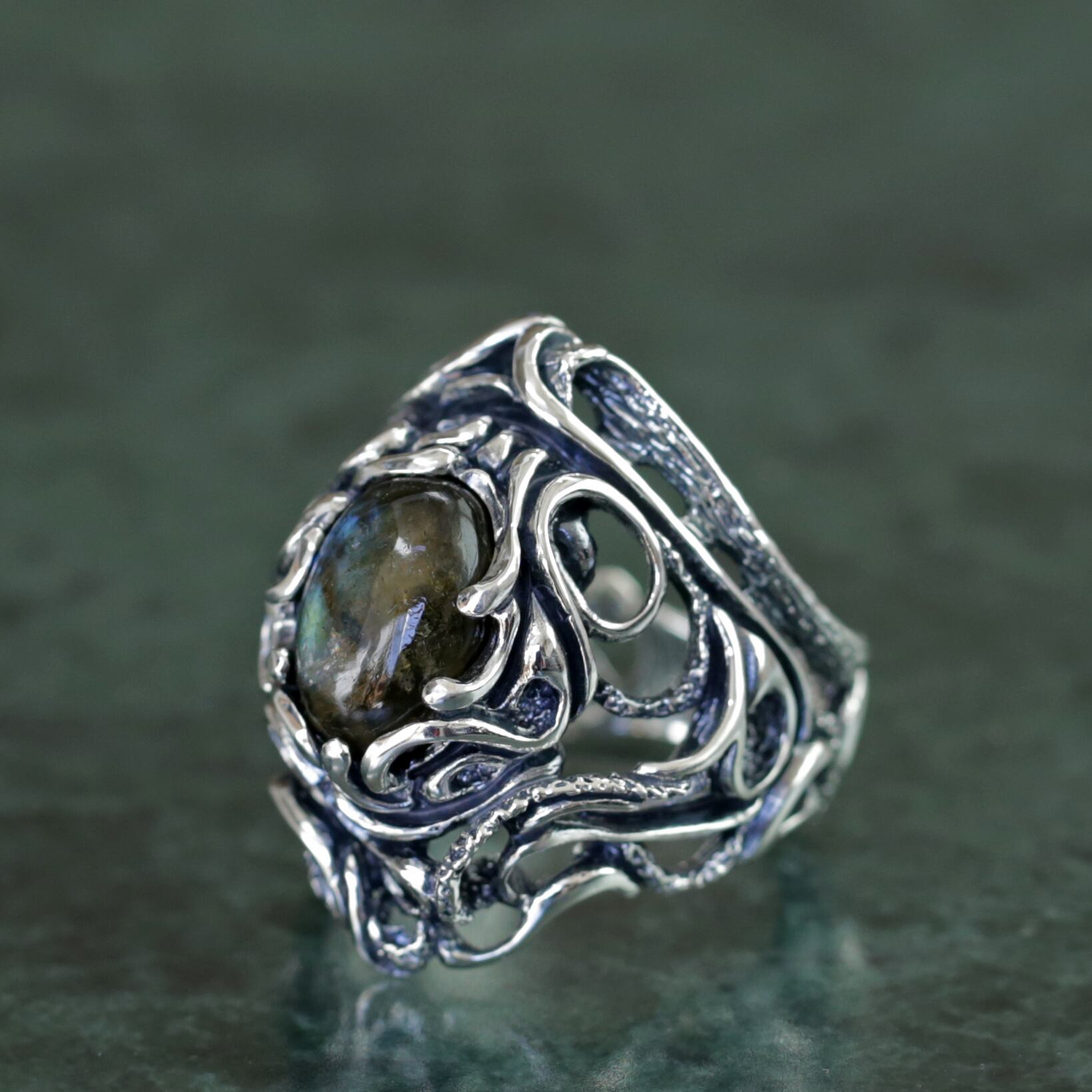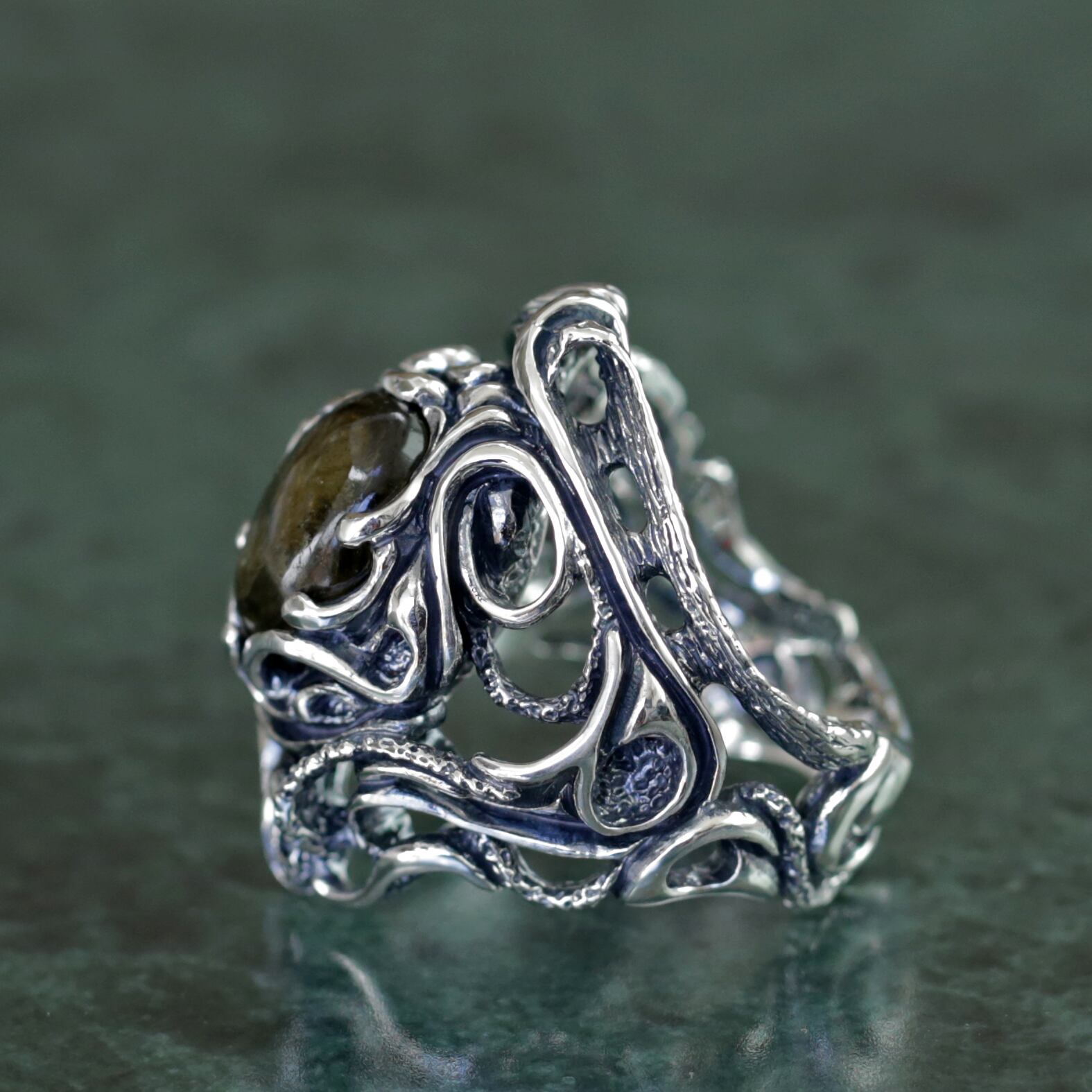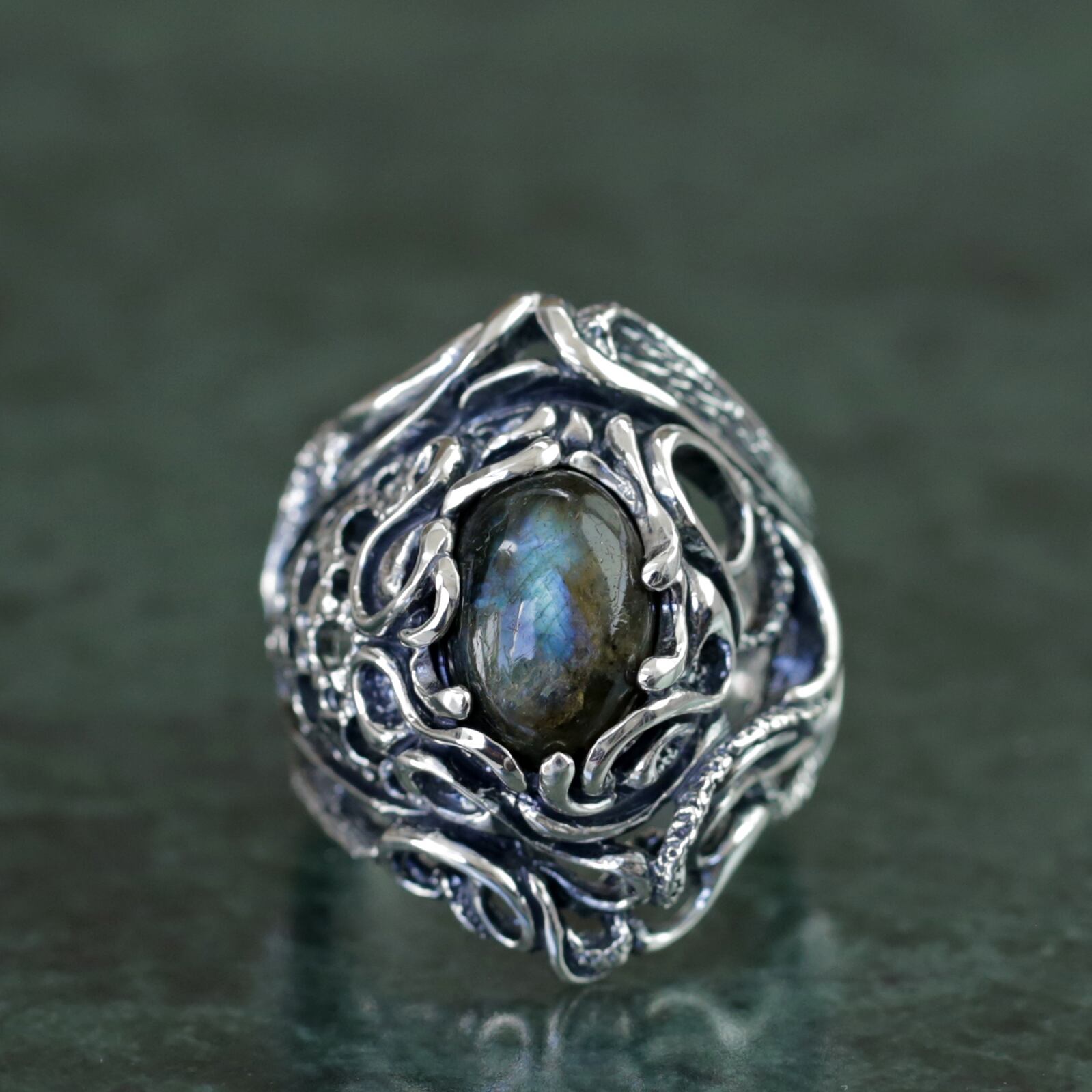 流動的なラインワークとその核となるラブラドライト。神秘的な生命の鼓動を感じるようなボリューム感あるリング。