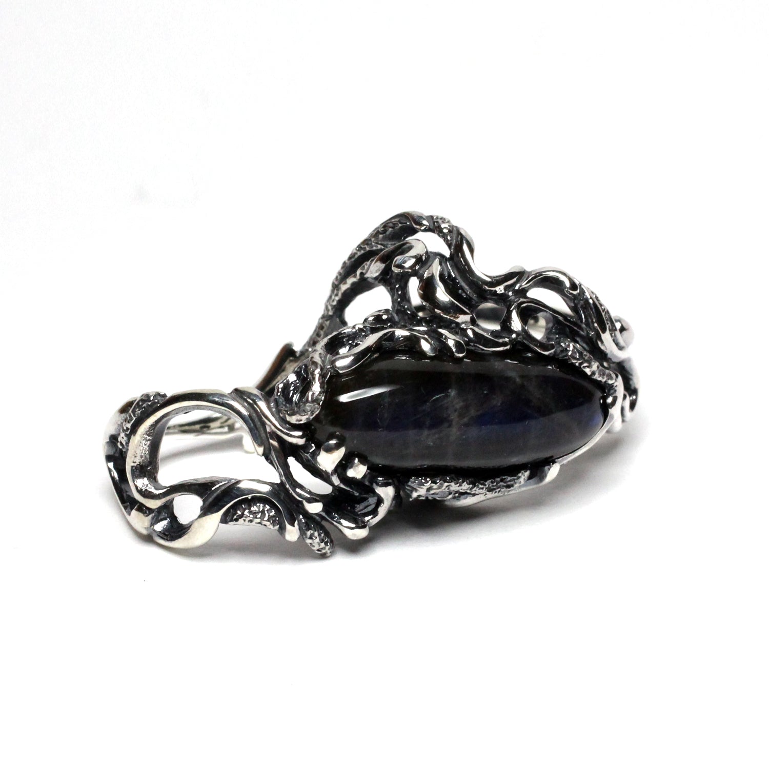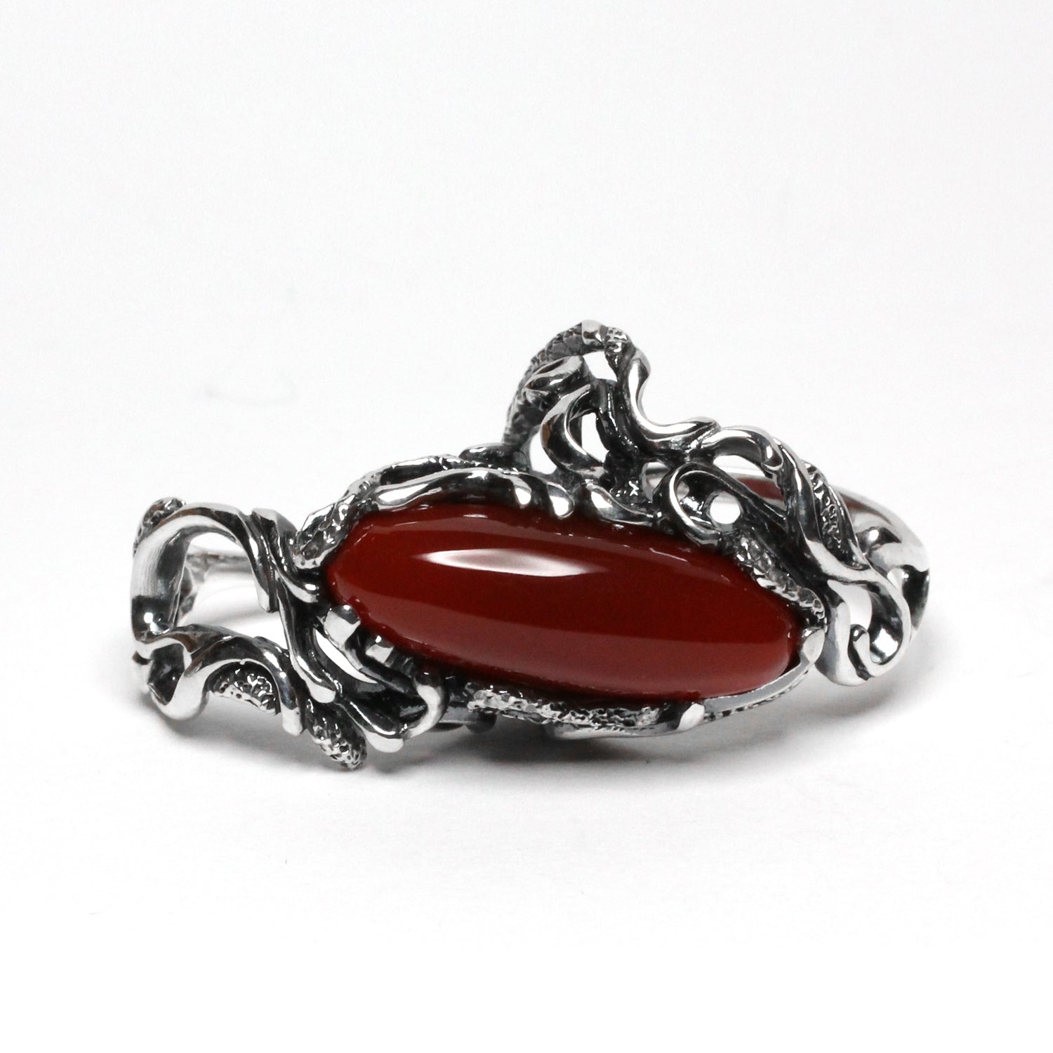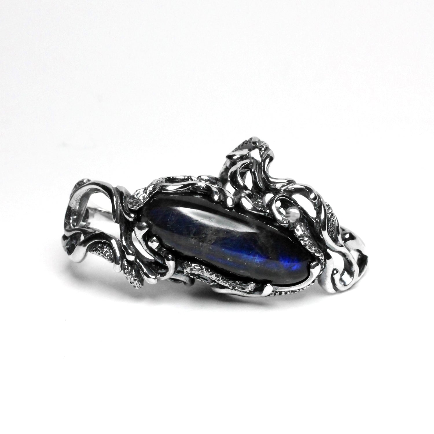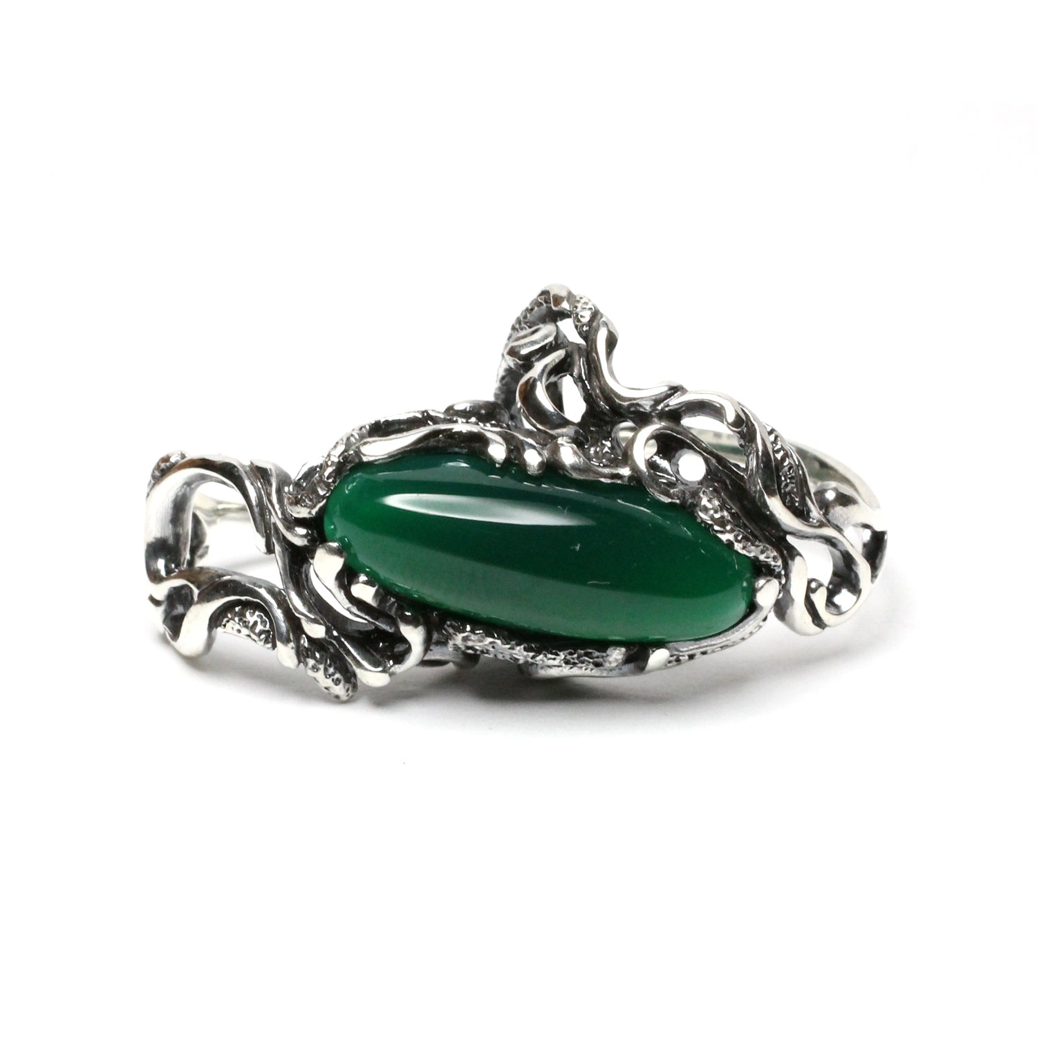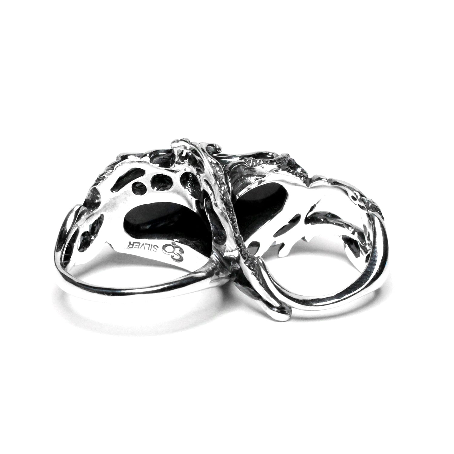 横長シルエットの天然石を大胆に配置した2本指リング。それぞれの指をめぐるラインワークが魅力のデザインです。