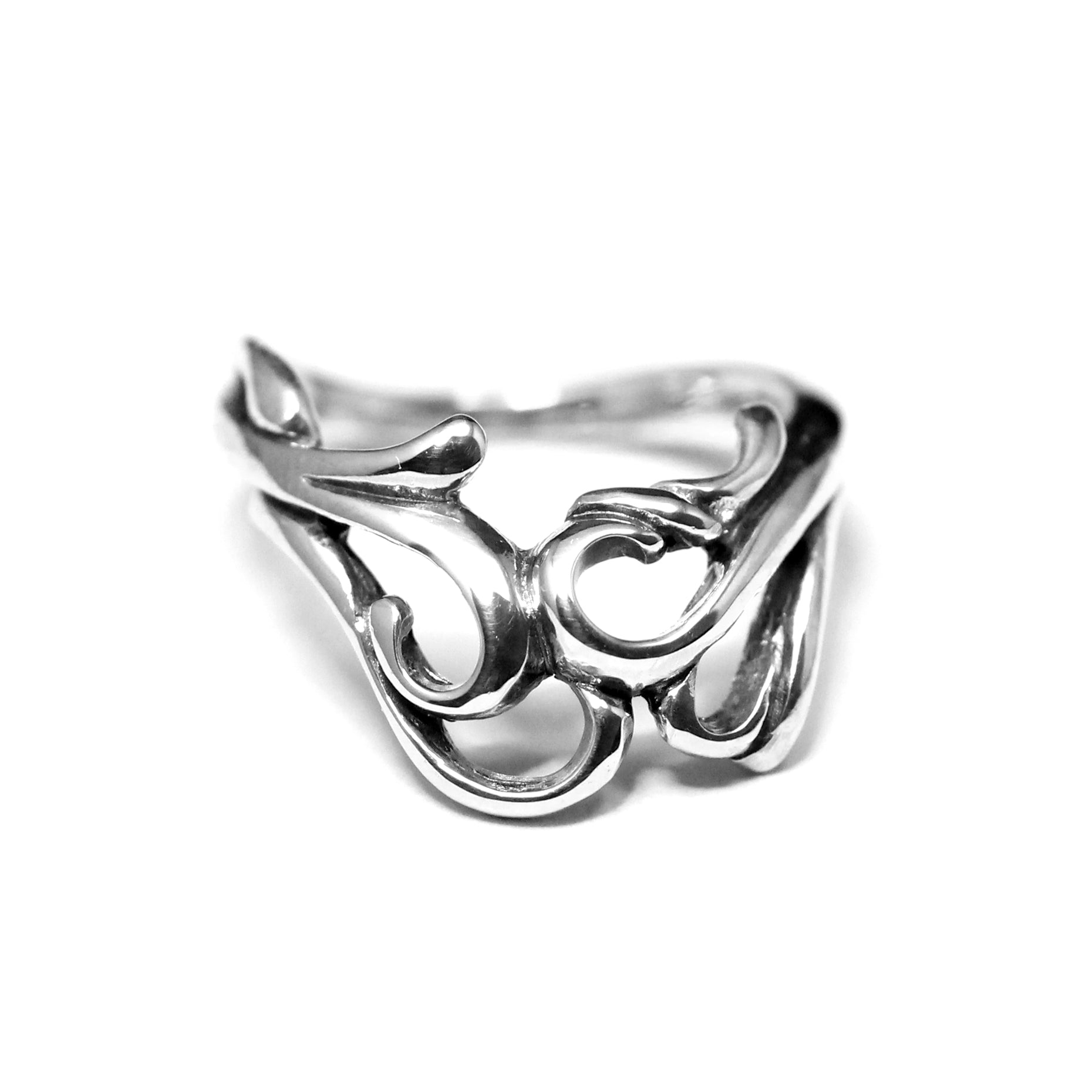 曲線と透かしが不規則なVラインを描くデザイン。ピンキーや重ね着けにもおすすめの、指に溶け込むような自然な装着感が特徴のリングです。