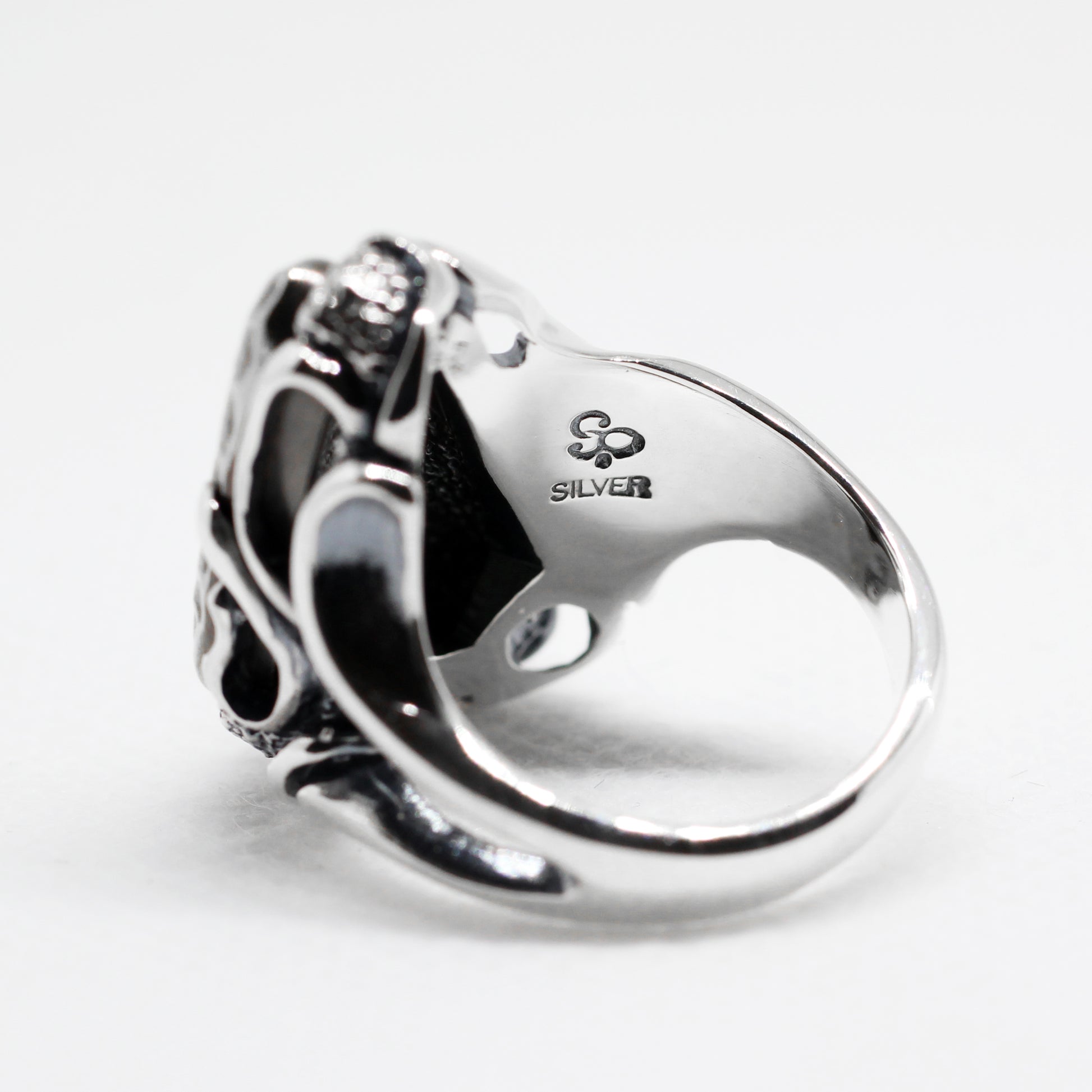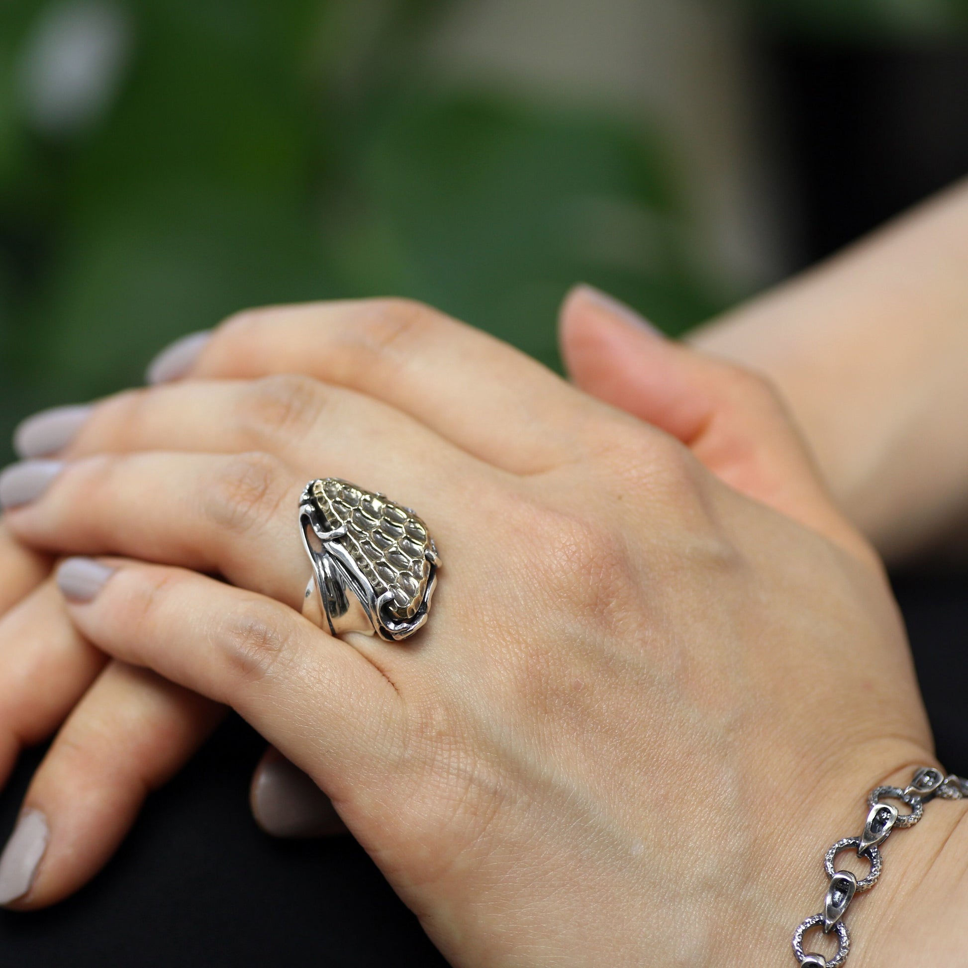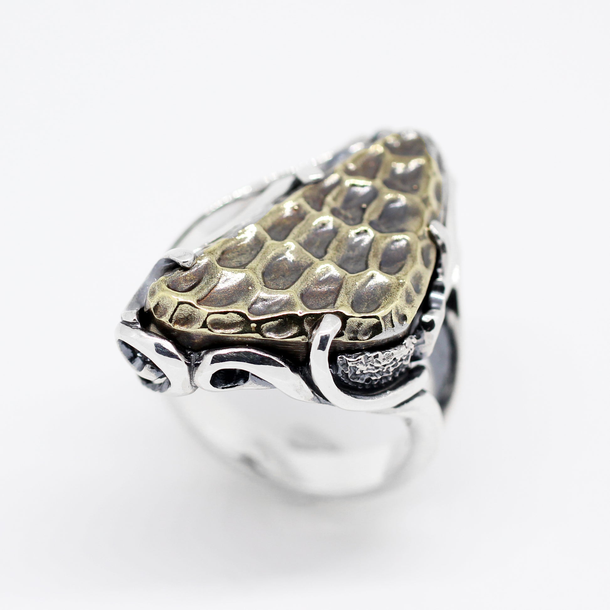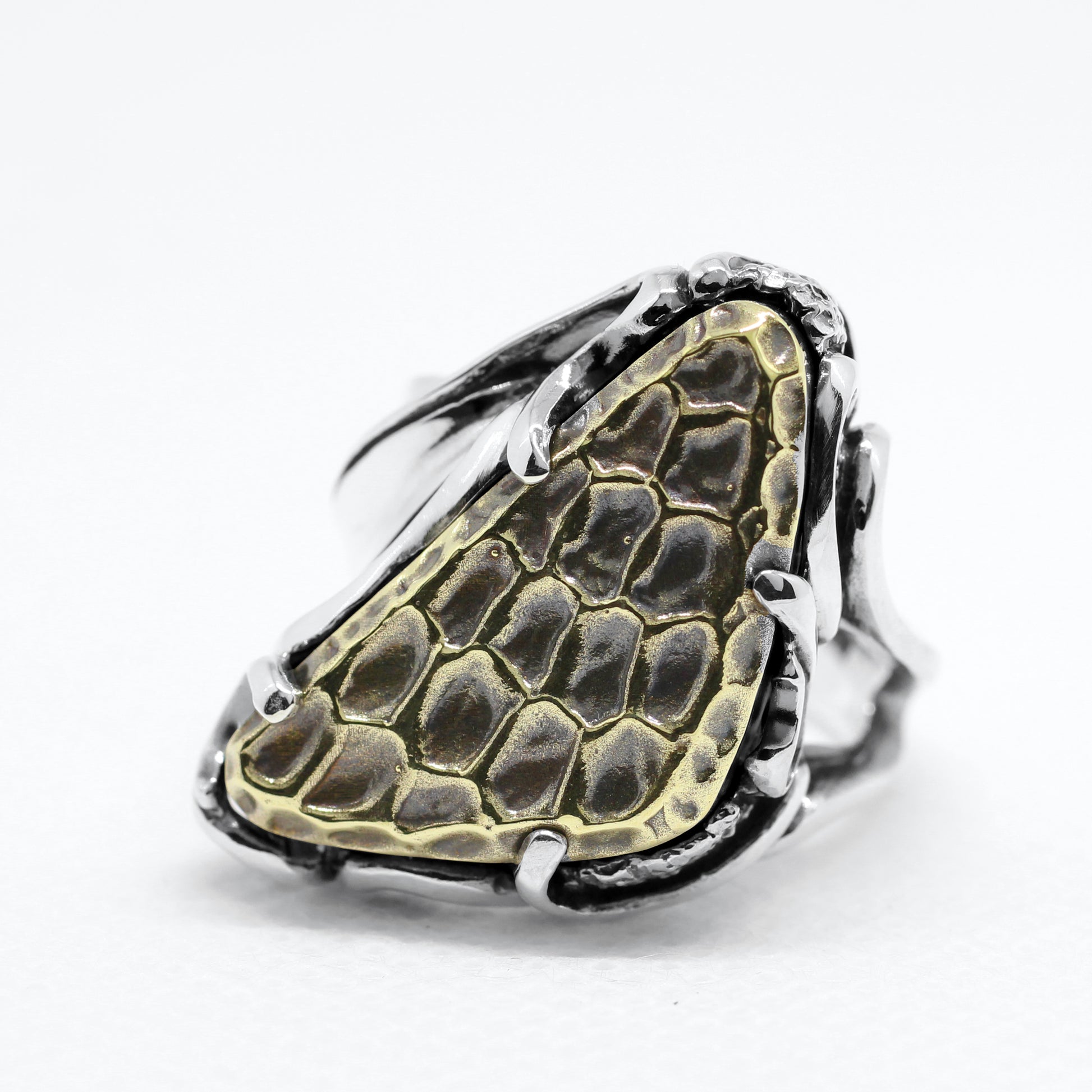 異素材とのコントラストが目を引くデザイン。不規則なシルエットがバランスよく指を飾る遊び心のあるリングです。