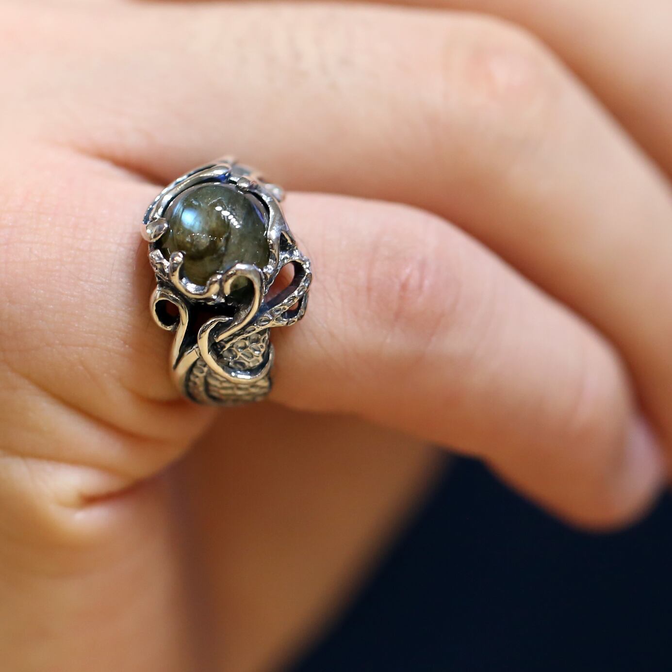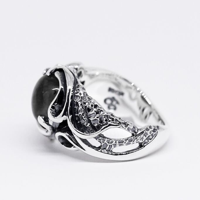 躍動感のあるラインに絡み合うようにセットされたラブラドライト。アンバランスさの中に存在する調和性がデザインされています。