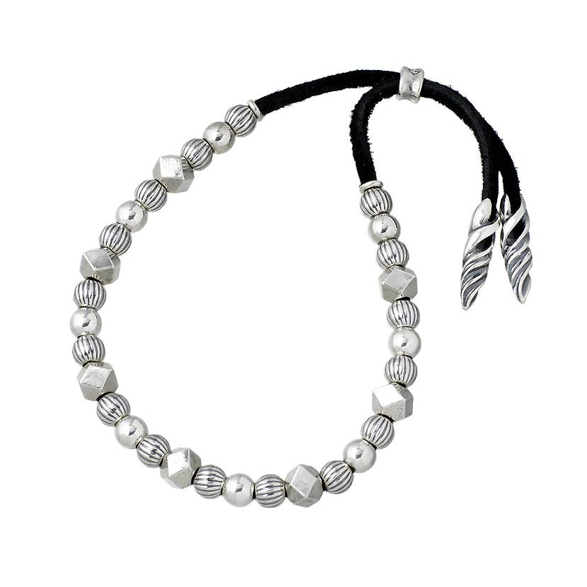 A leather cord bracelet expresses the slim and sleek silver's luster, using multi-faceted cut parts.