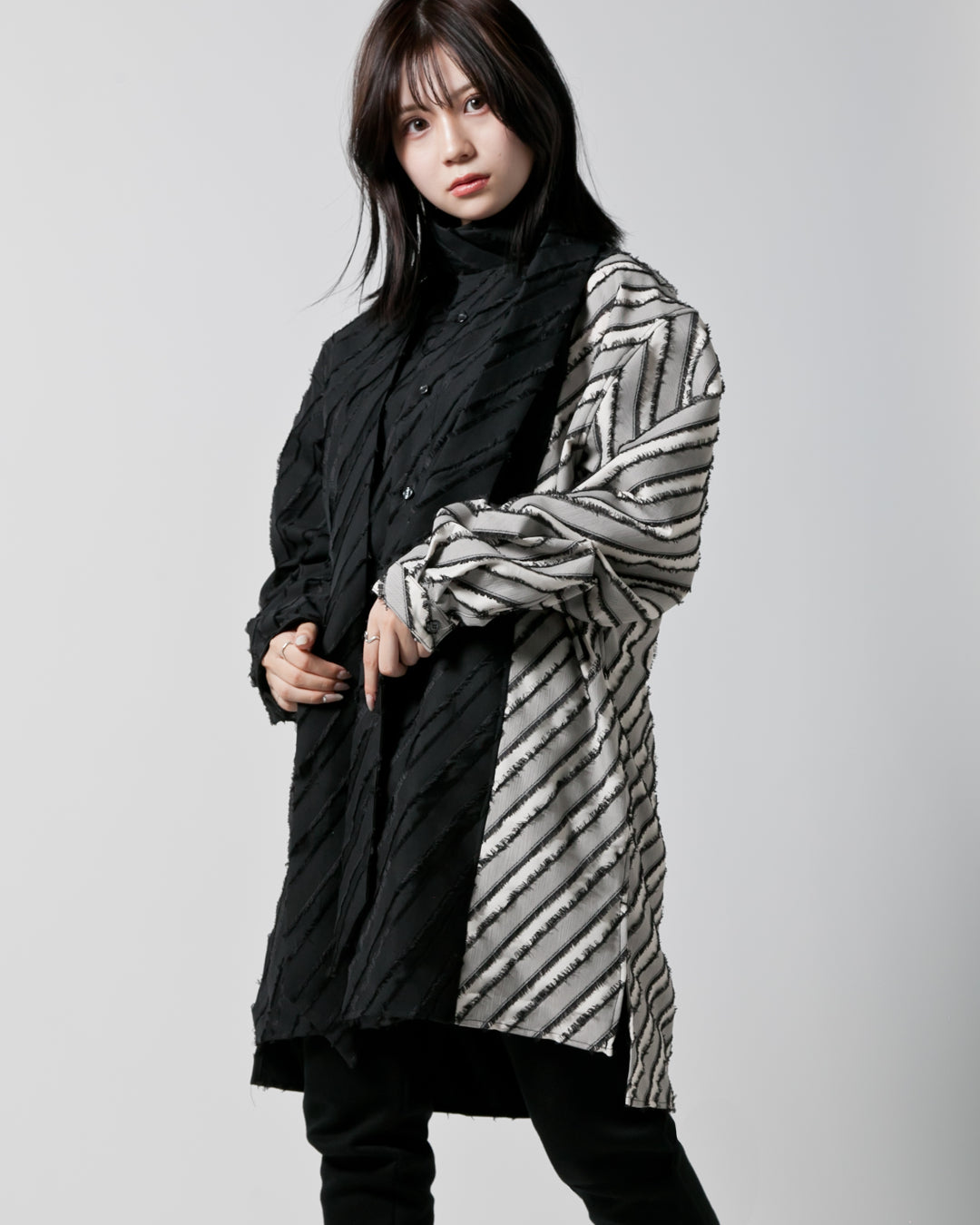フリンジのように織られたストライプカットジャカード生地2色で切り替え、衿パネルに同生地黒のロングリボンタイを組み上げたデザイン。スカーフのようにそのまま下げても、首に巻くカタチでも、用途様々に好バランスなコンバートが可能な設計です。