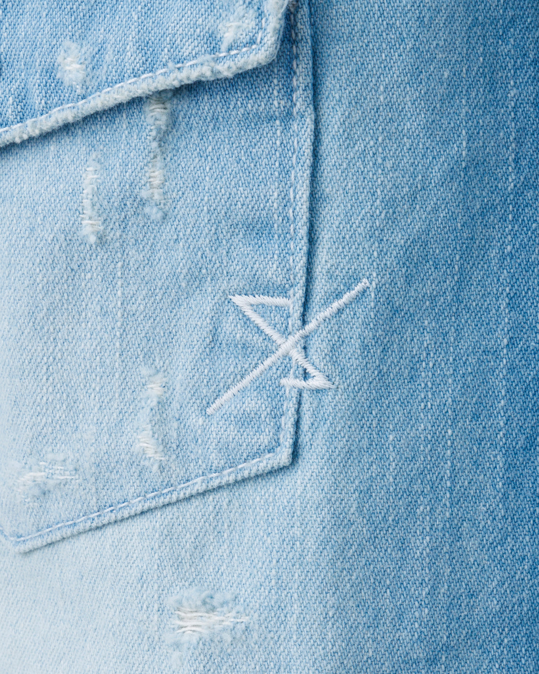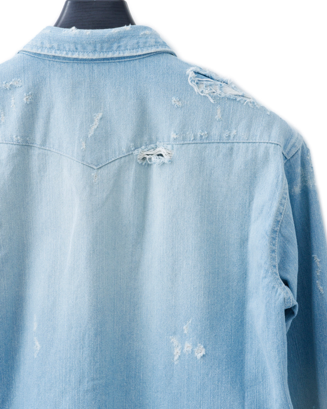 ショルダーヨークやフラップ付きの胸ポケット、スナップボタンなど、ウエスタンシャツのディテールを踏襲したデザインを特徴に、ハイブリーチを加えて全体の色味を落としつつ、ヒゲやブラスト、オーバーダイで強弱のあるダメージ&クラッシュエフェクトを与えて仕上げています。身体のラインにフィットするミニマルなタイトシルエットに組み上げ、雰囲気と色気のある大人のモードを感じさせます。