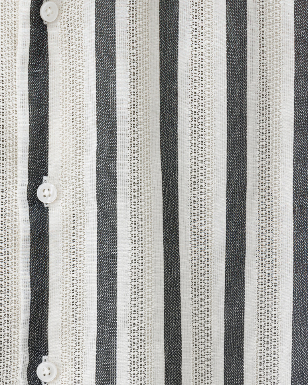 スラブ糸を使い、メッシュのような網目のカラミ織りとサテン組織を組み合わせたストライプレギュラーカラーシャツ。