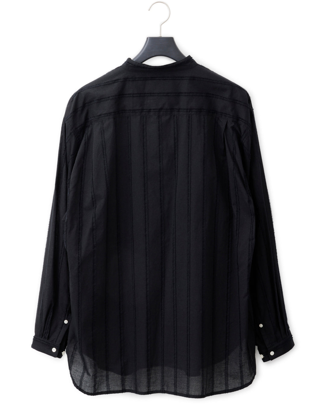 60S/細番手の糸で丁寧に織られたコットンローン。カットドビーによるストライプ状のフリンジで表面変化をもたせた意匠のローン生地を使用したノーカラーオーバーフィットシャツ。