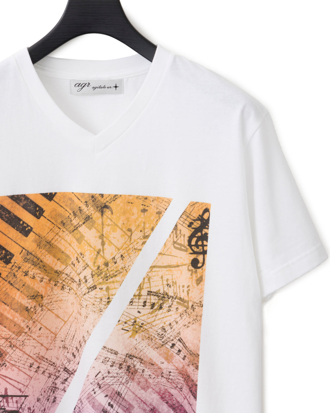 オリジナルグラフィックをインクジェットプリントで仕上げたVネックTシャツ。
