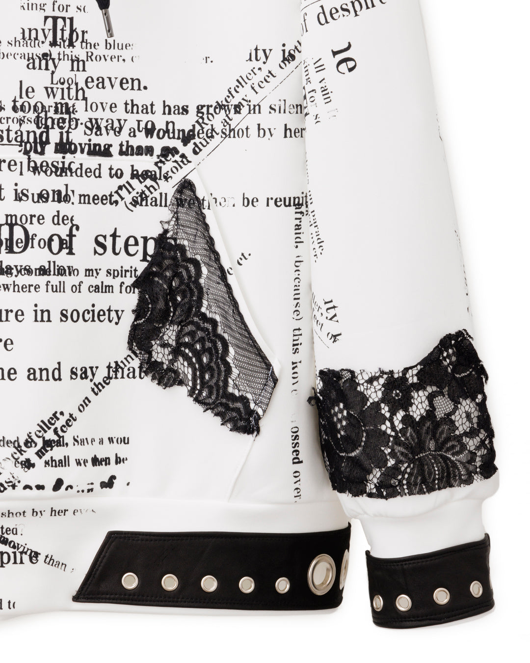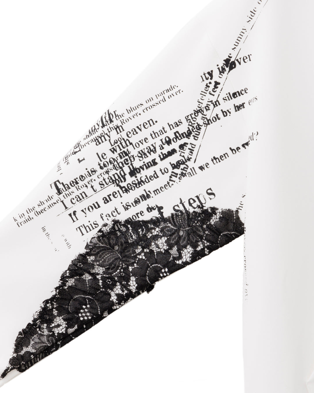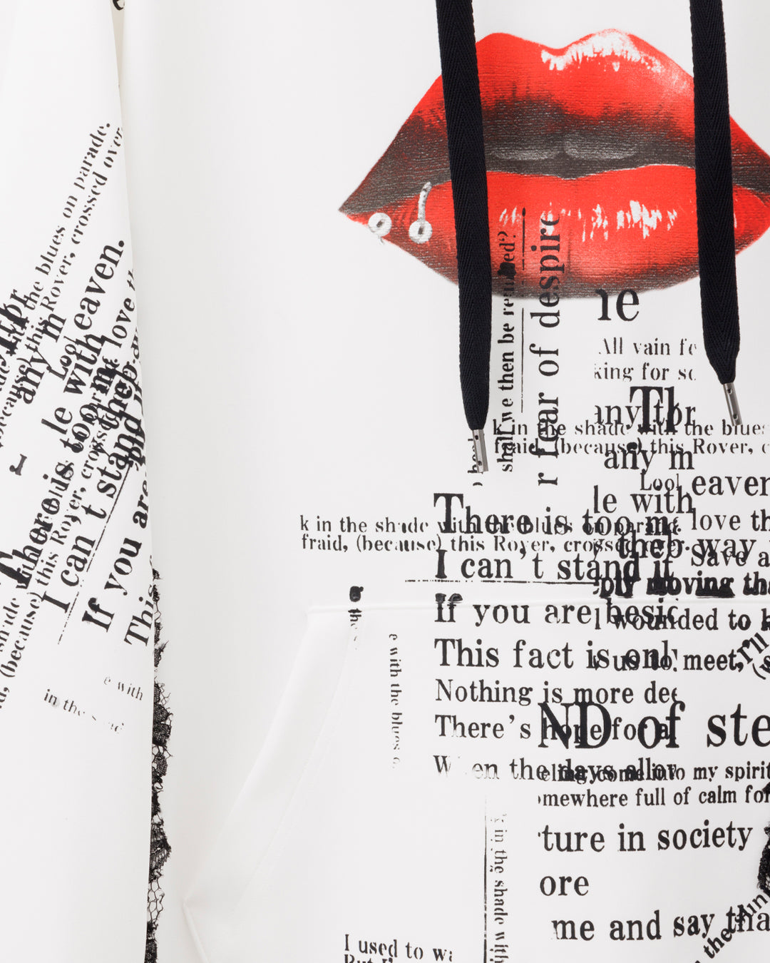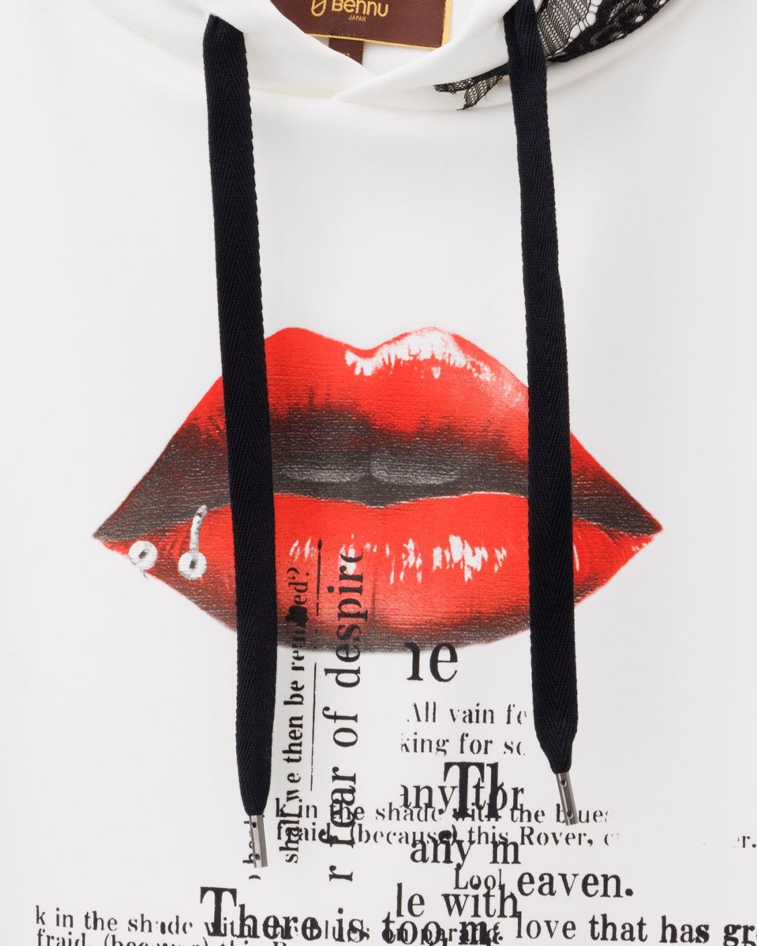 Bennuオリジナルイラスト『THE LIPS』をプリントし、革やレースという異素材のアレンジに加えて、ハトメ打ちや英字プリントなど高宮氏のフルハンドメイドで加算した作品です。
