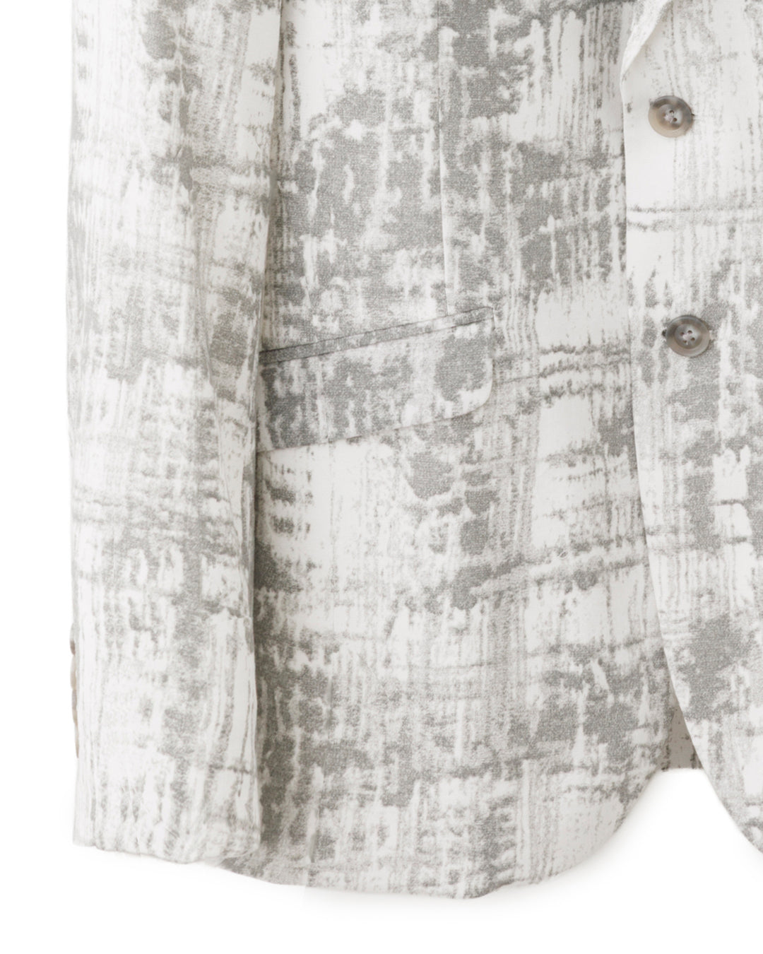 通気性に優れ、軽量でソフトな肌触りを実現したテンセルレーヨンのプレミアムブレンド素材。柔らかなホワイトを基調に独特のムラチェック柄をあしらい、さらにぼかし加工を重ねることで現代的抽象的な絵画のような印象に仕上げたデザインテキスタイルのセットアップジャケット。