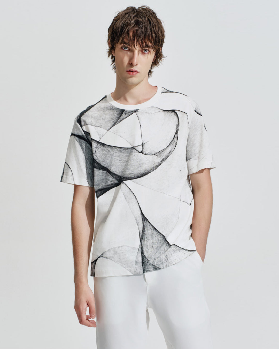 1枚のTシャツに現代的なエッジを加えるアーティスティックなシャドーパターン。ファッションを通して着る人の個性を引き出す1着は、流行にとらわれないレギュラーフィットなのでワードローブの定番として長く愛用して頂けます。