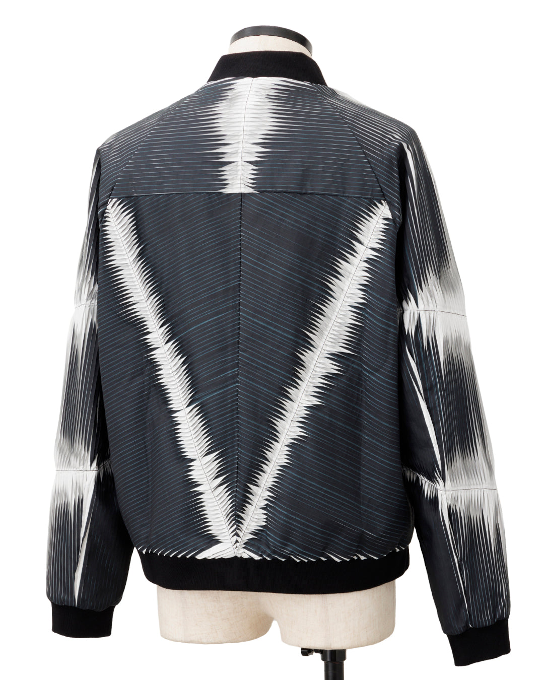 表面のみ染色したナイロン生地を、細密なプレスプリーツで構築したボンバージャケット。
