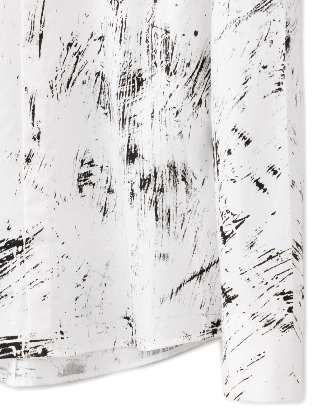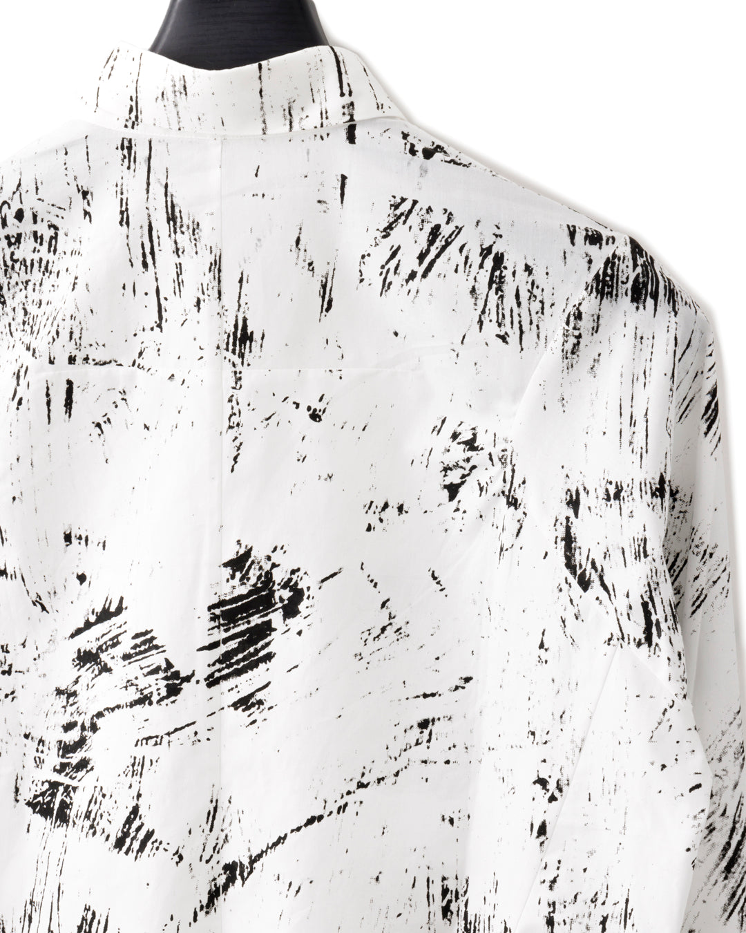 コットン100%の細番手糸をハイカウントで編み上げ、タイプライタークロスのような程良いハリとクリアな表面感をもつ高級ブロードを使用し、抽象柄のグラフィック「Back to Zero」を全面プリントで仕上げたデザインシャツ。