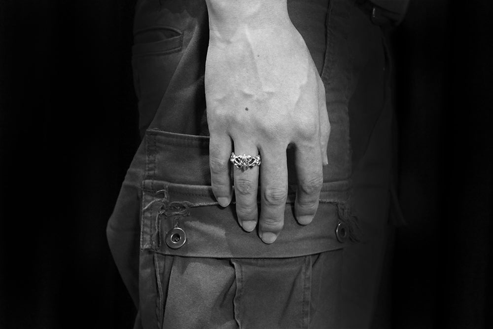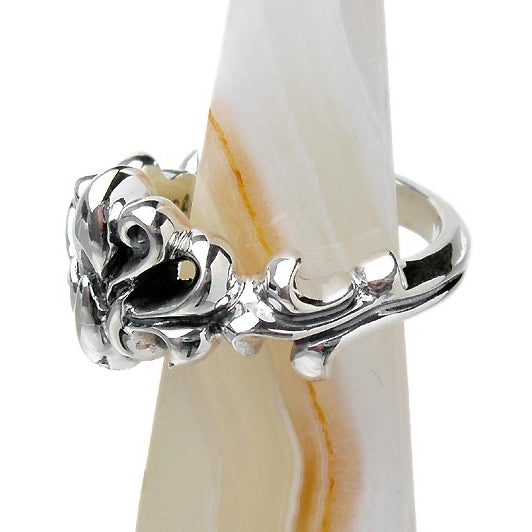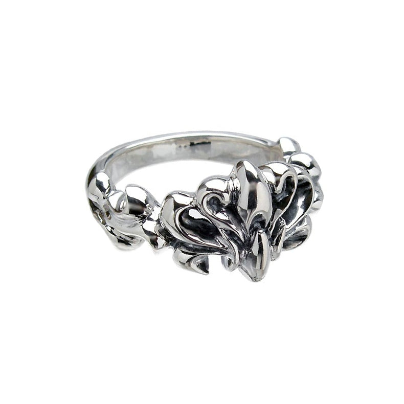 花が開く瞬間、花びらから雫が落ちる瞬間を、銀の光沢で表現したリング。