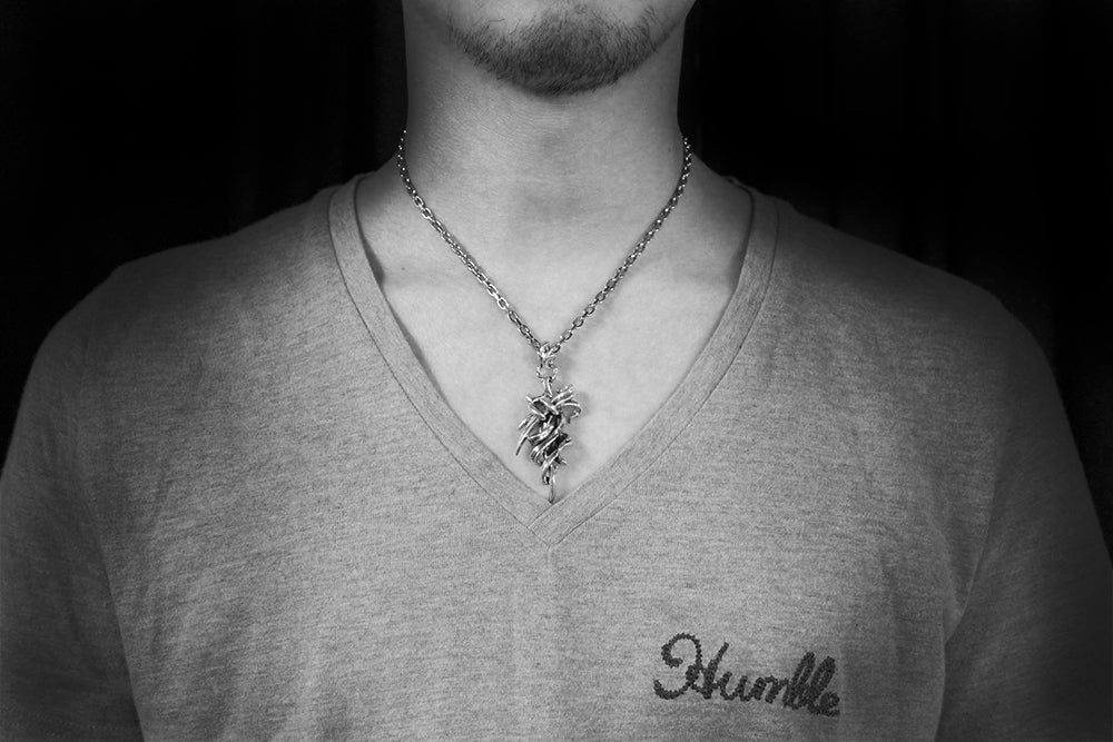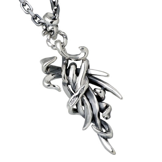 時に鋭く、時に滑らかに、それぞれのラインが交差し絡み合った瞬間、ひとつの形が生まれる。自然界の矛盾の無い「360℃の流れ」を意識したペンダント。