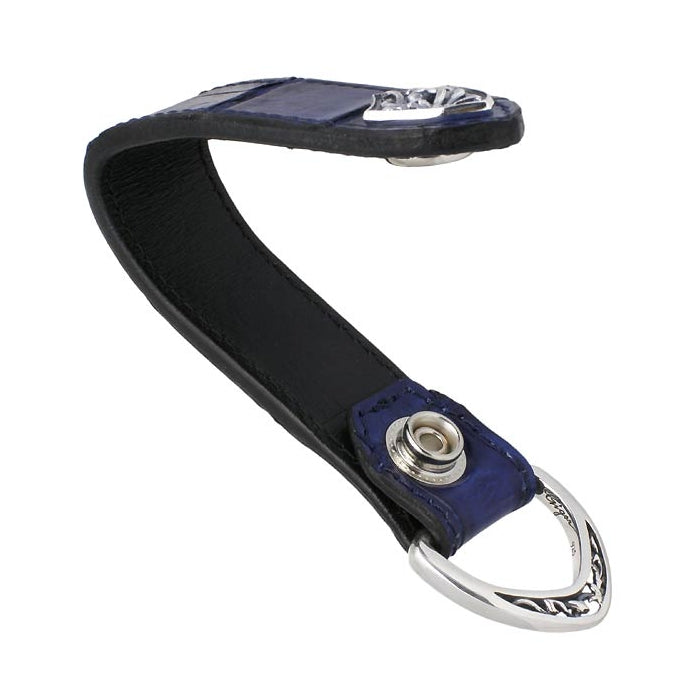 具象=蛇が獲物を捕える前に身を潜める静けさや勢いよく飛びかかる空気を、曲線美を用いて表現したレザーベルトループ。伝統的な本藍染めのクロコダイルレザーを使用しています。