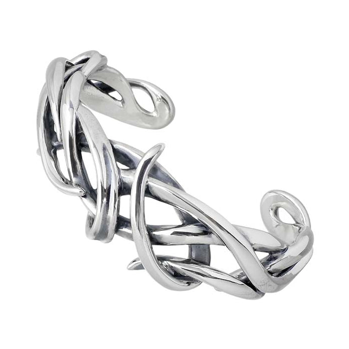 時に鋭く、時に滑らかに、それぞれのラインが交差し絡み合った瞬間、ひとつの形が生まれる。自然界の矛盾の無い「360℃の流れ」を意識したバングル。