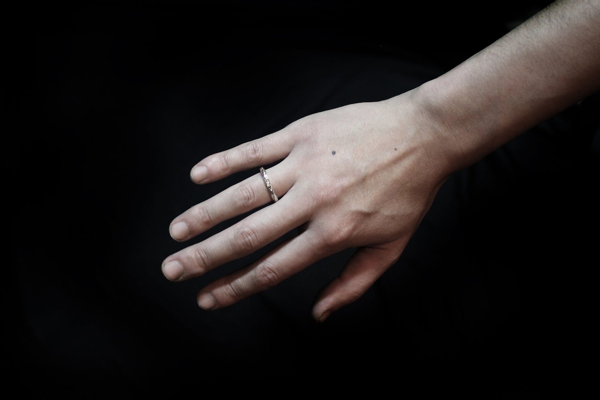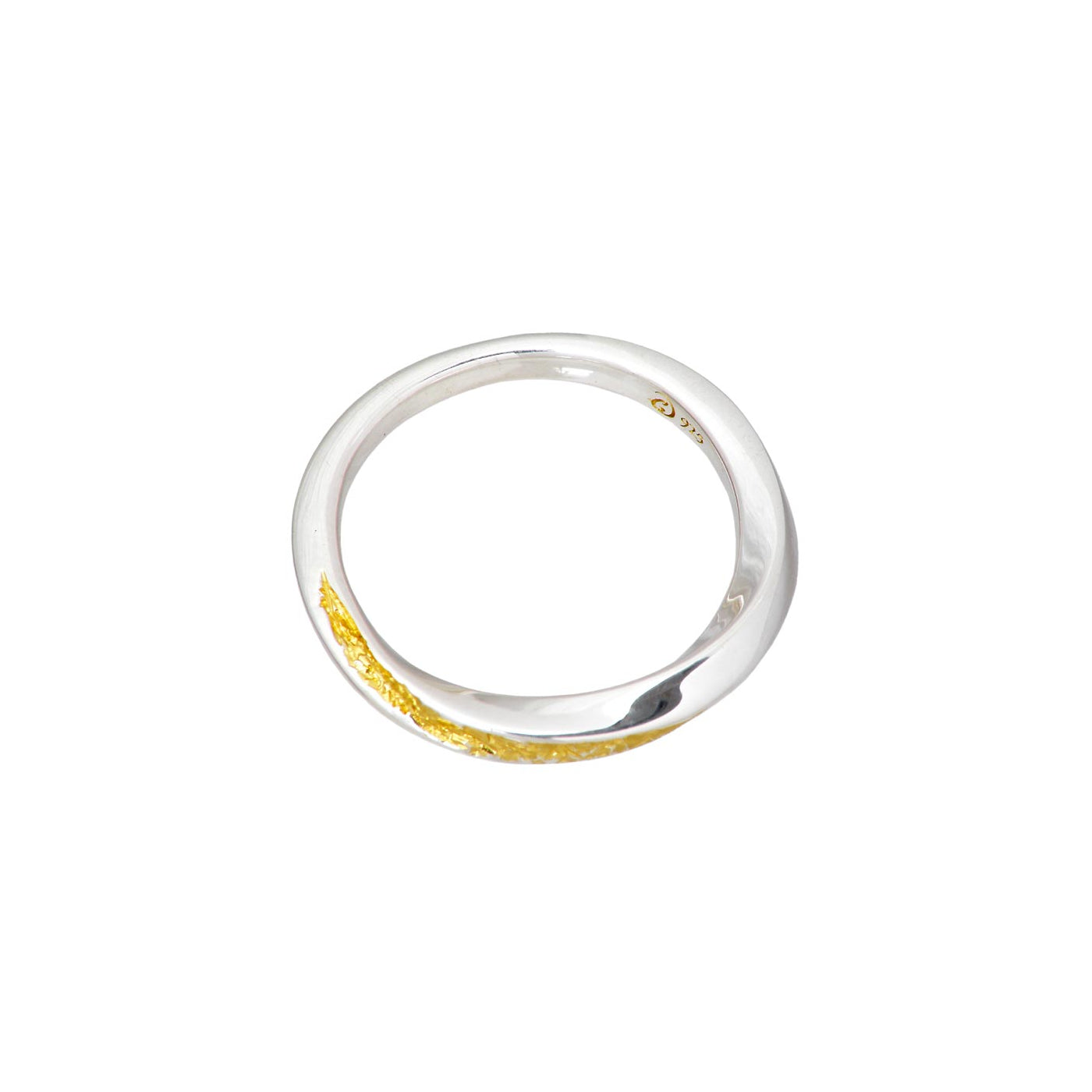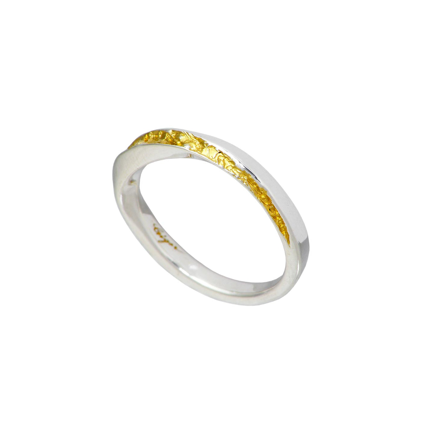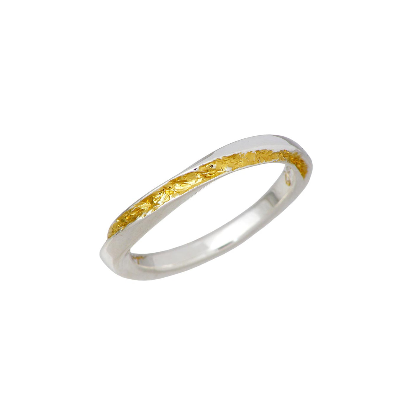 180度ツイストした銀の光沢の一面から金鉱脈が隆起したかのように表現されたリング。