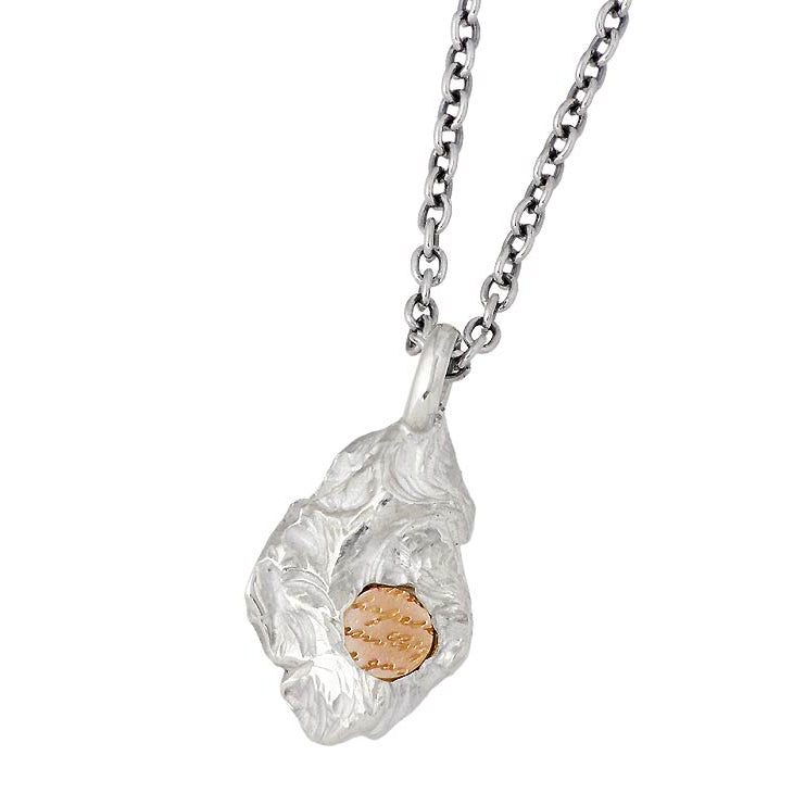 ヤジリに使われていた黒曜石が割れた瞬間、金の石盤が現れたかのように表現したペンダント。