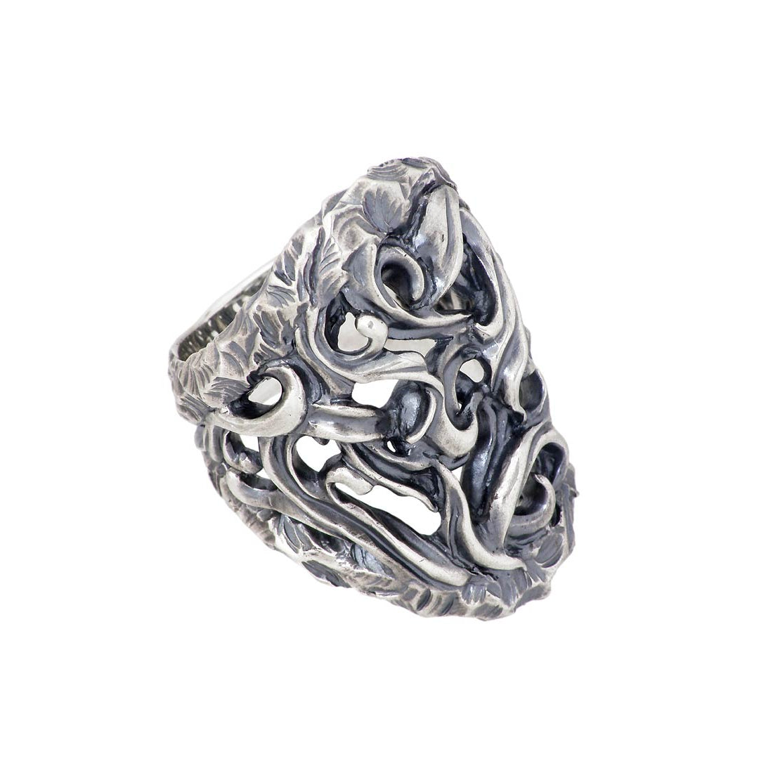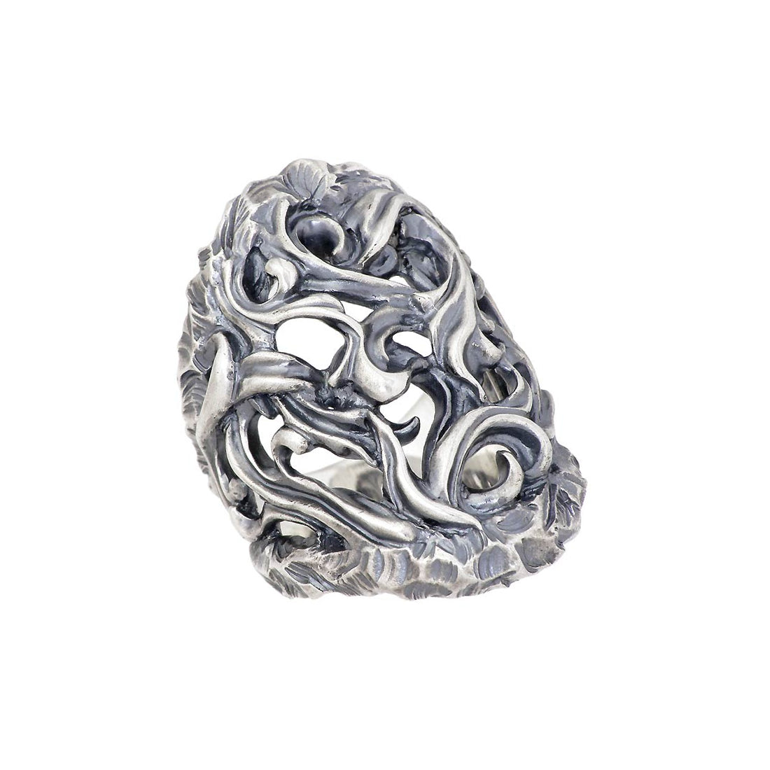 ヤジリに使われていた黒曜石。その断面をオーバル状に模し、生命感のある透かしレリーフを融合させたリング。