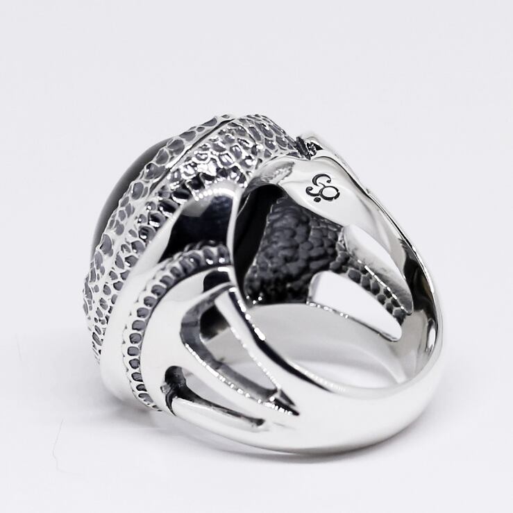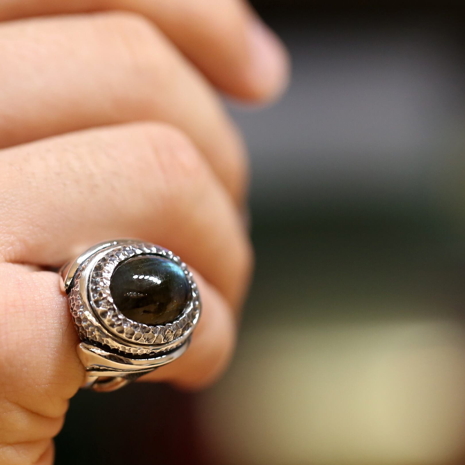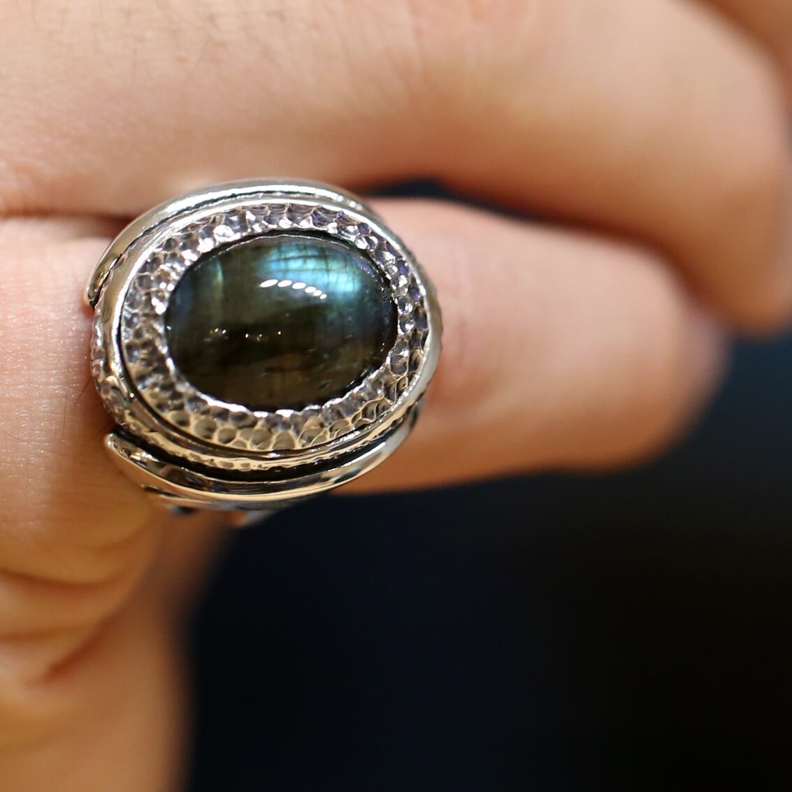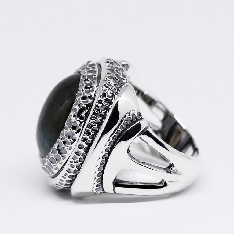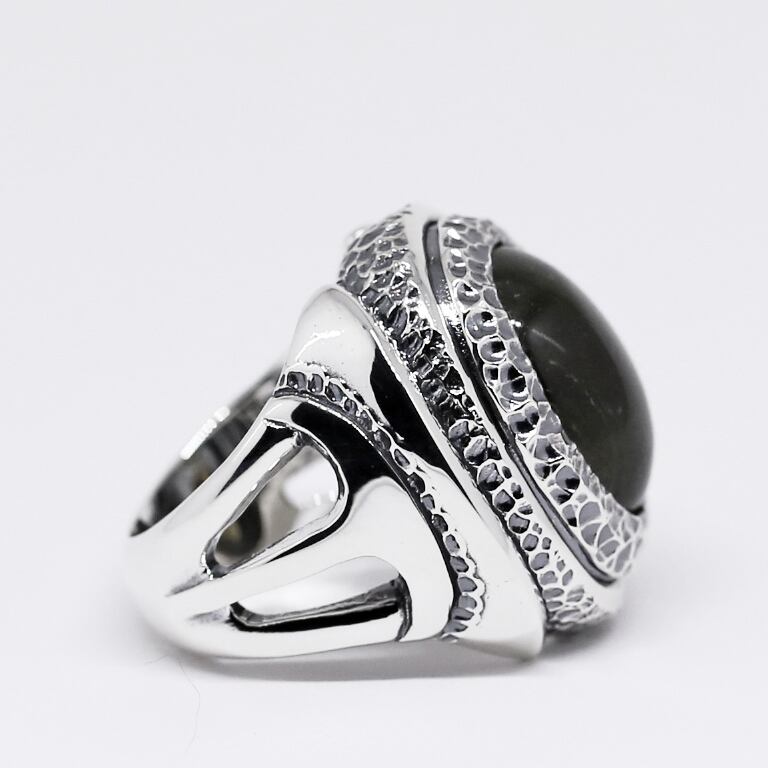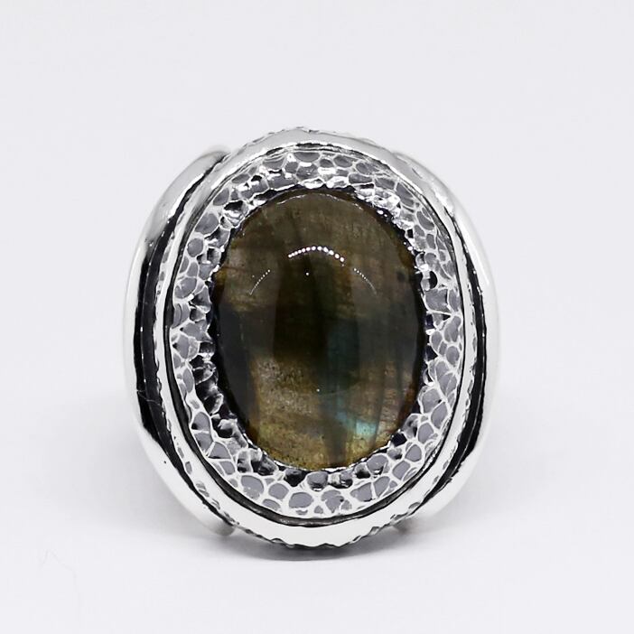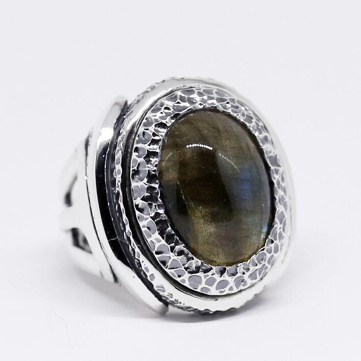 テクスチャーの中に溶け込むようにセットされたラブラドライト。華美な装飾を抑えることでラブラドライト本来の美しい色合いが引き立ち、存在感を見せながらスマートに着用できるリングです。