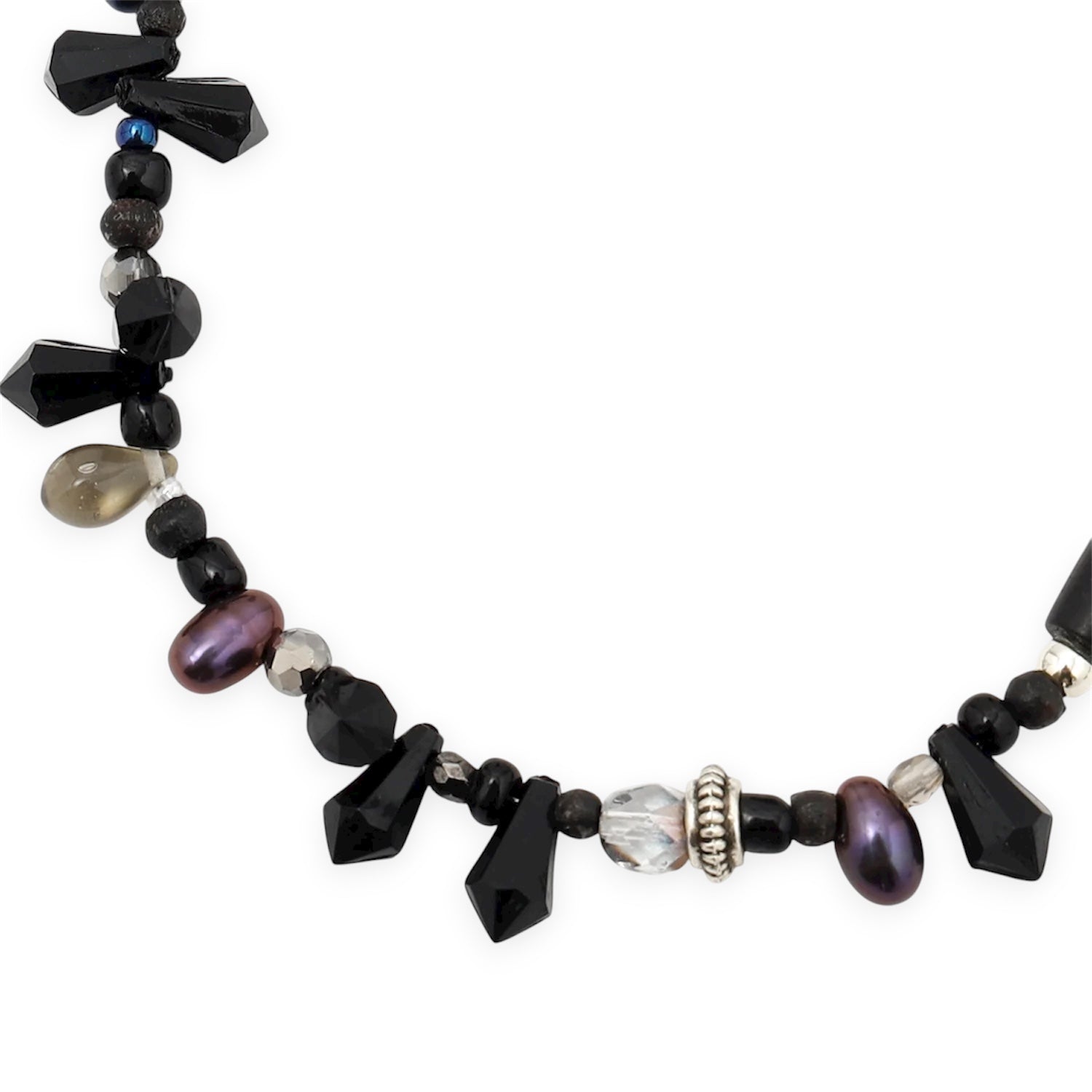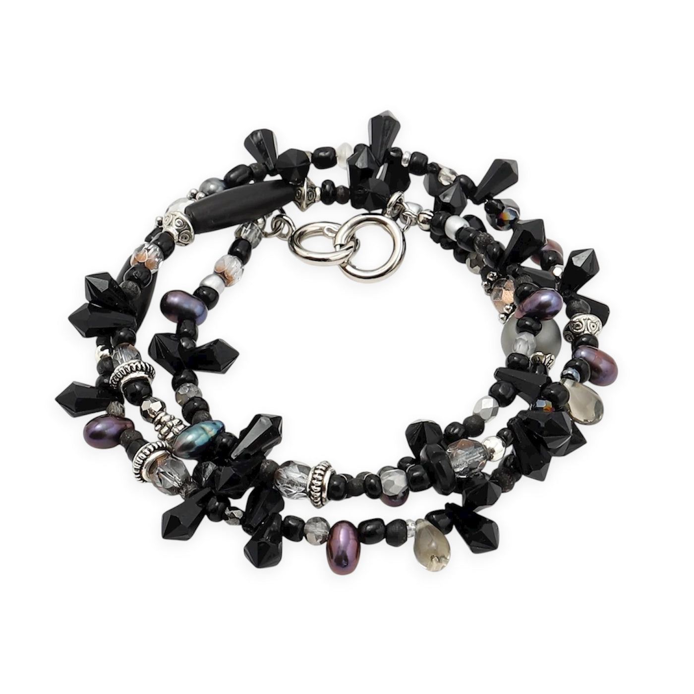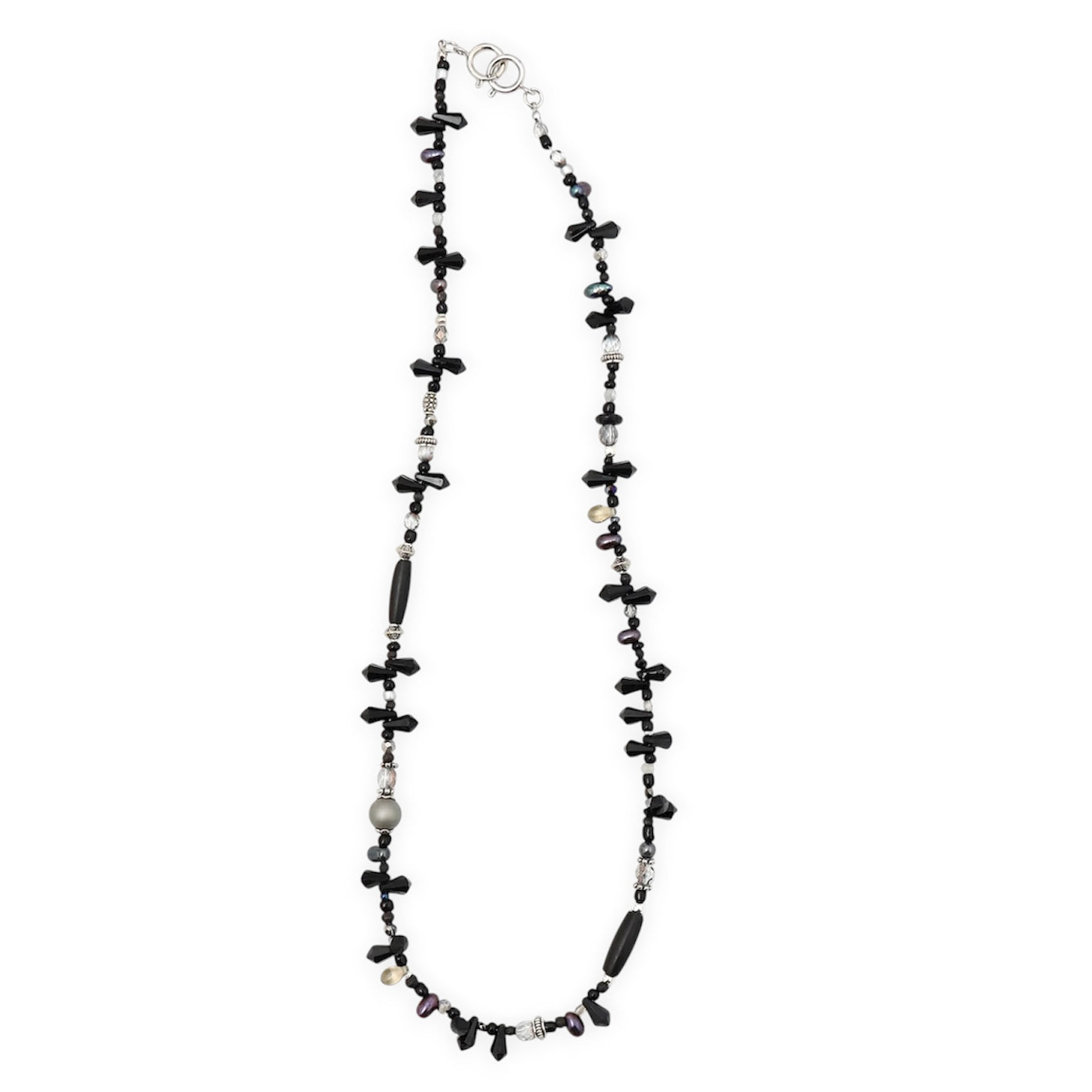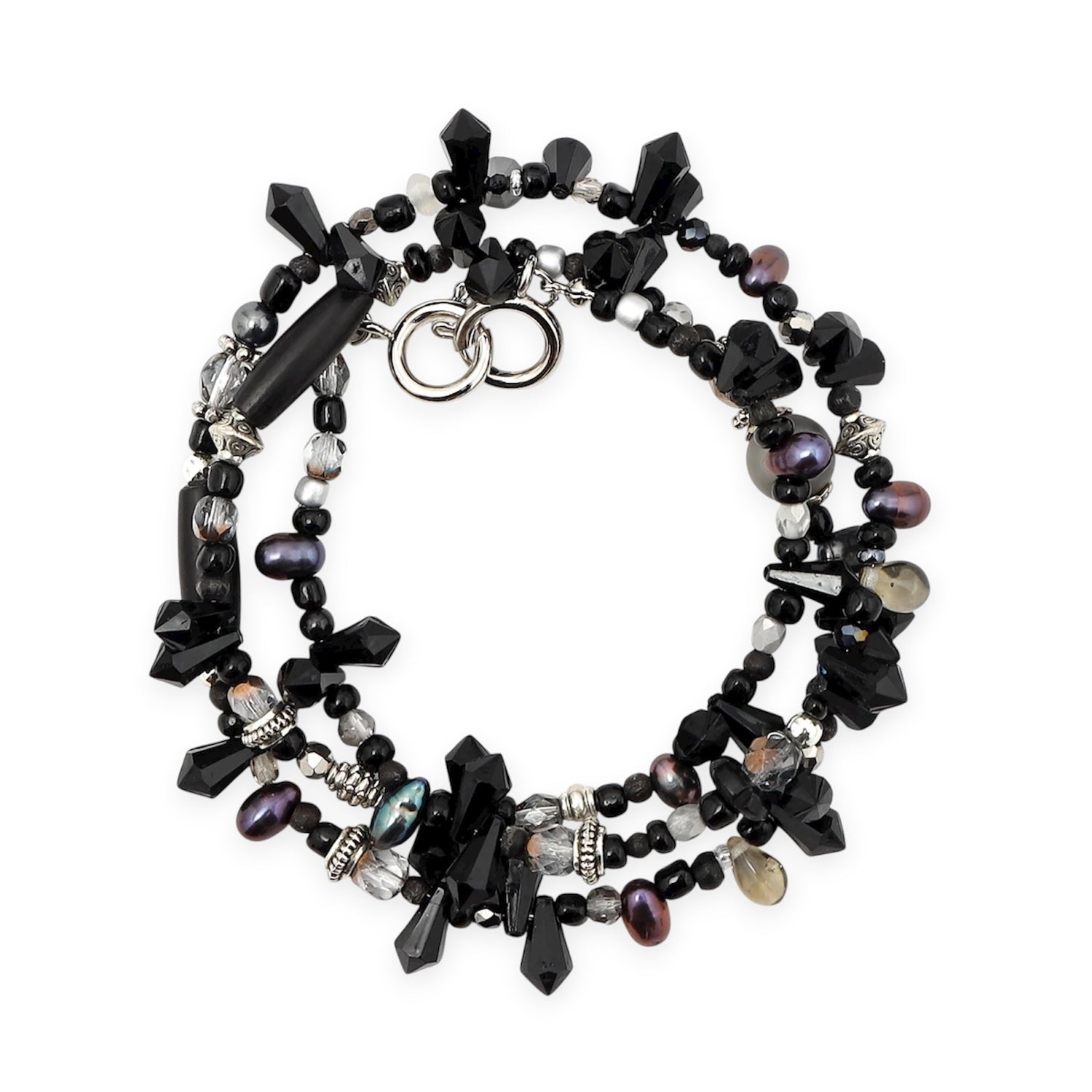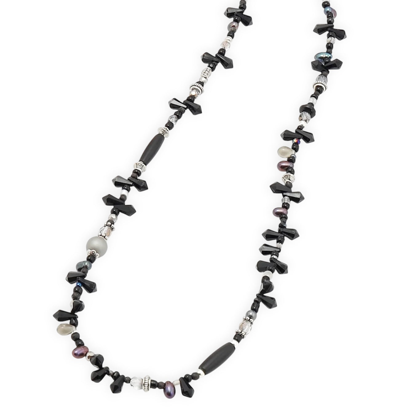 希少価値の高い細長の淡水パールを使用。ダークでミステリアスなモノトーン。