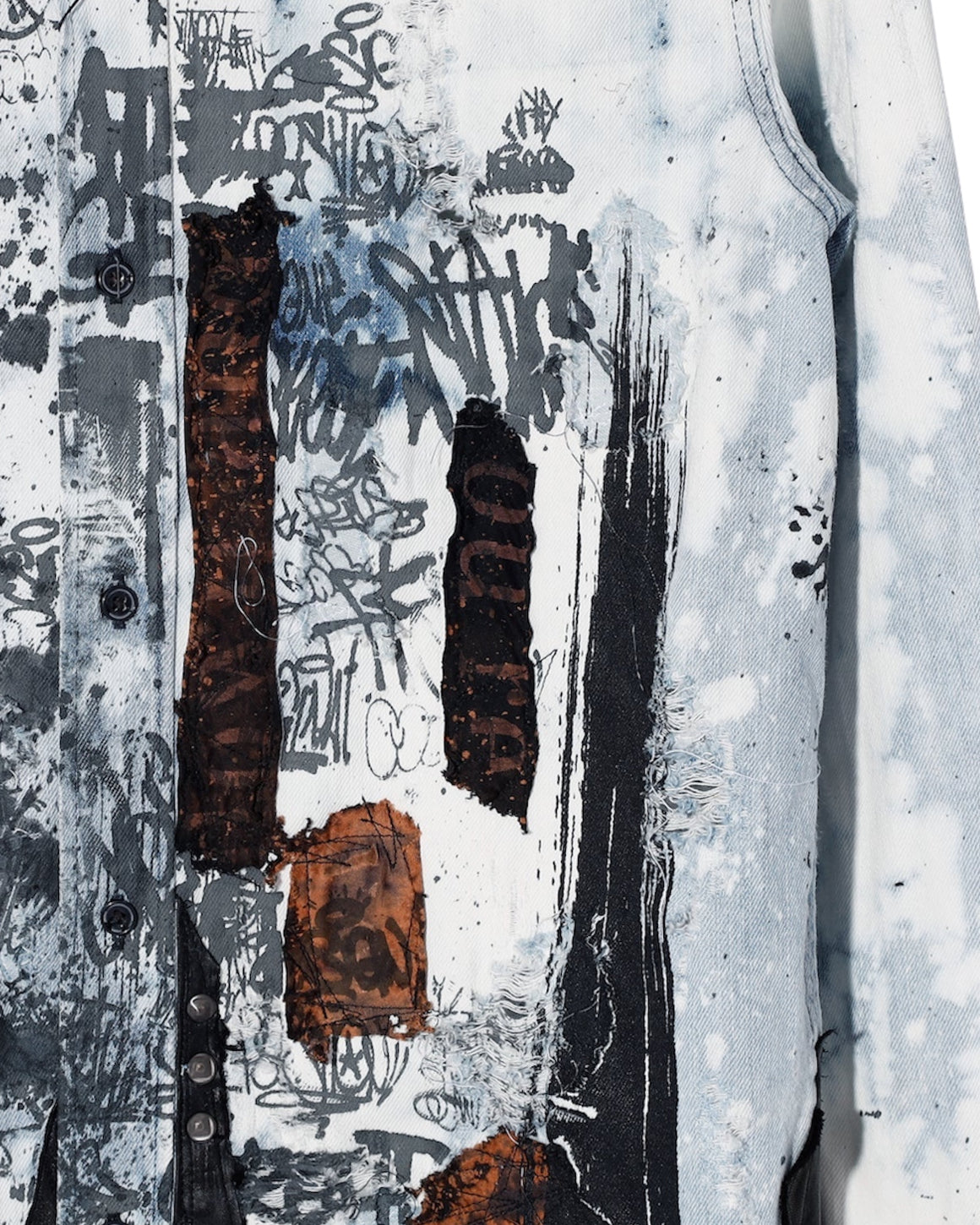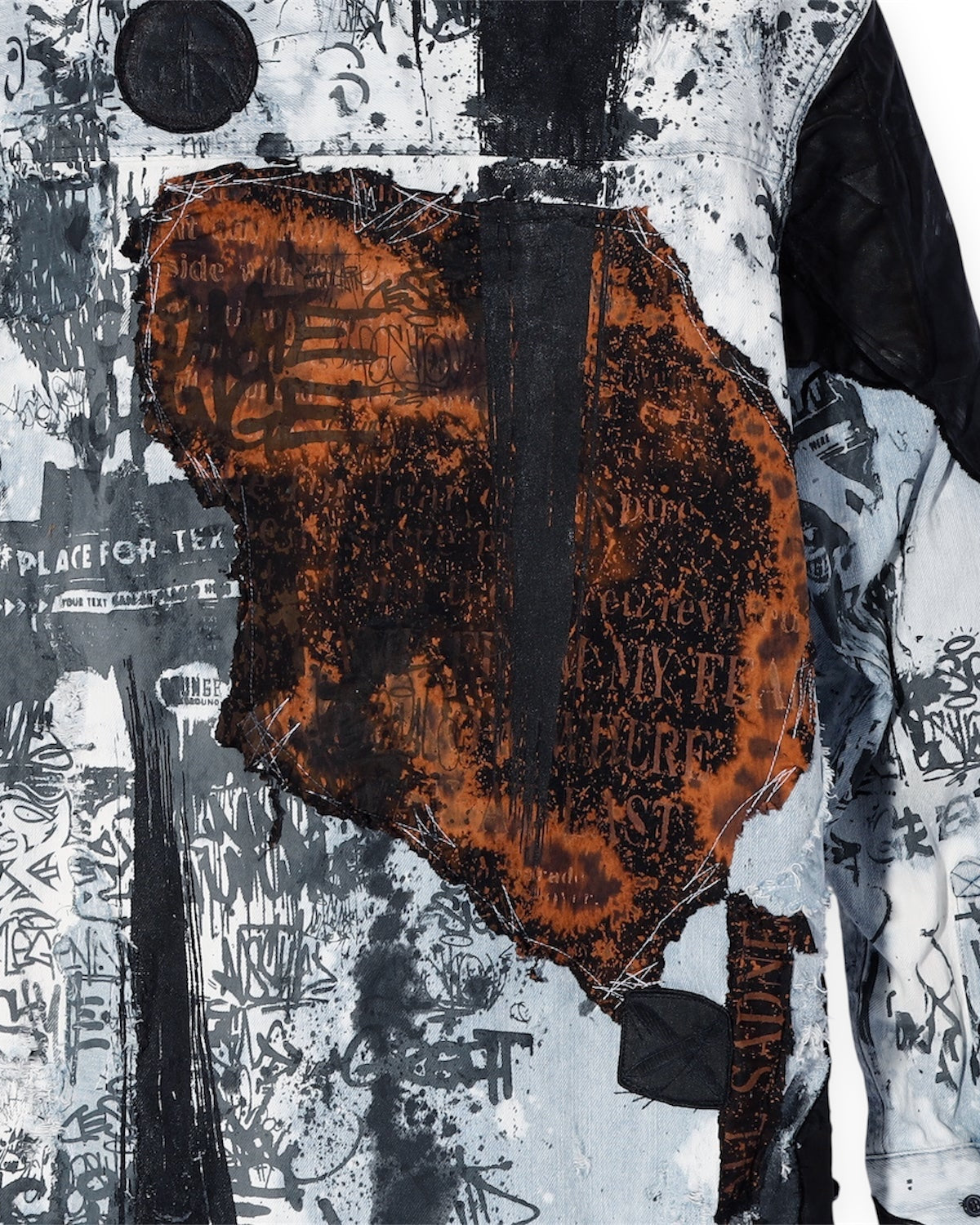 素材ブリーチ、多重加工したファブリック、鋲、レザーアレンジ、そして顔料塗布など、DIYの要素を今の技術でできる限り盛り込んだ仕様になっています。