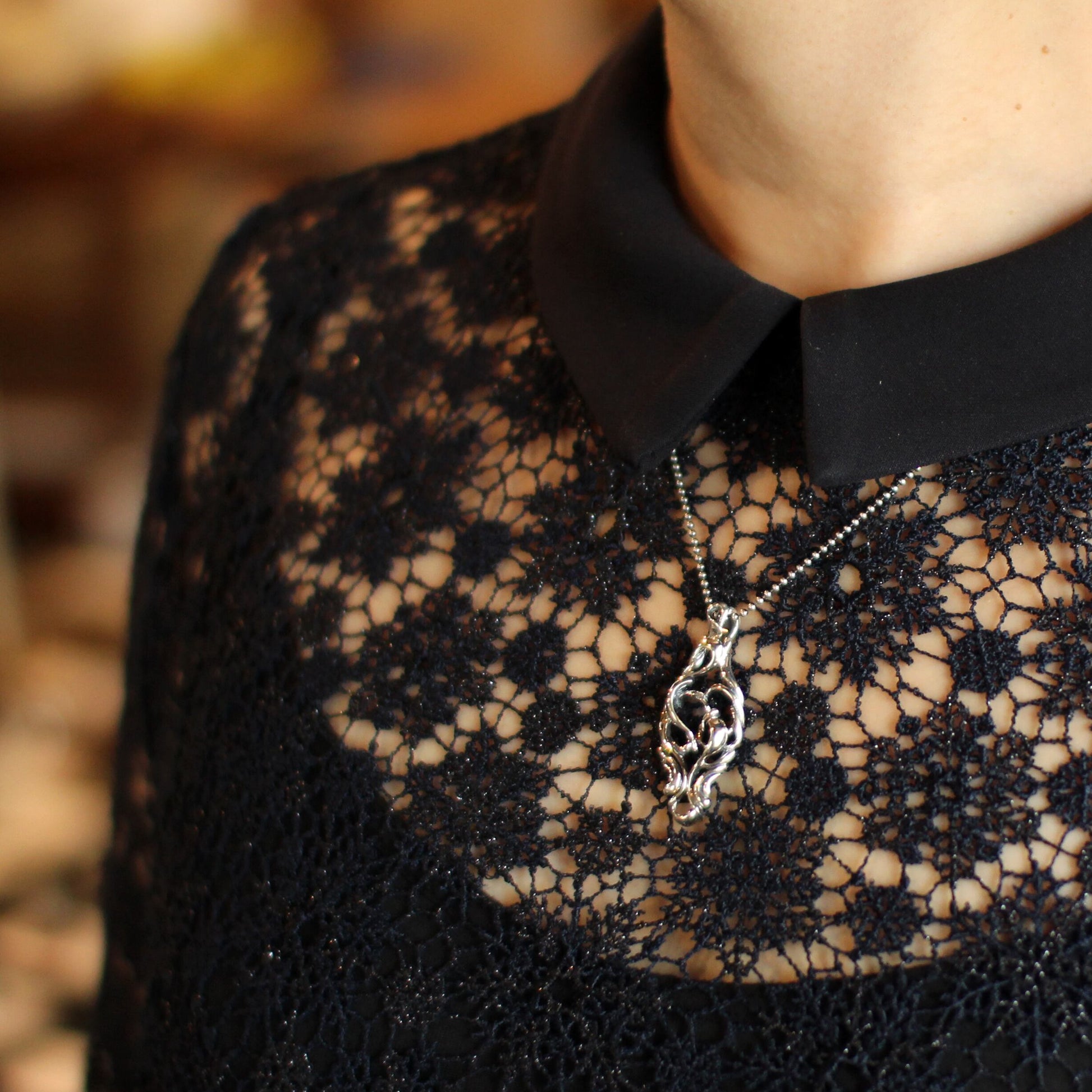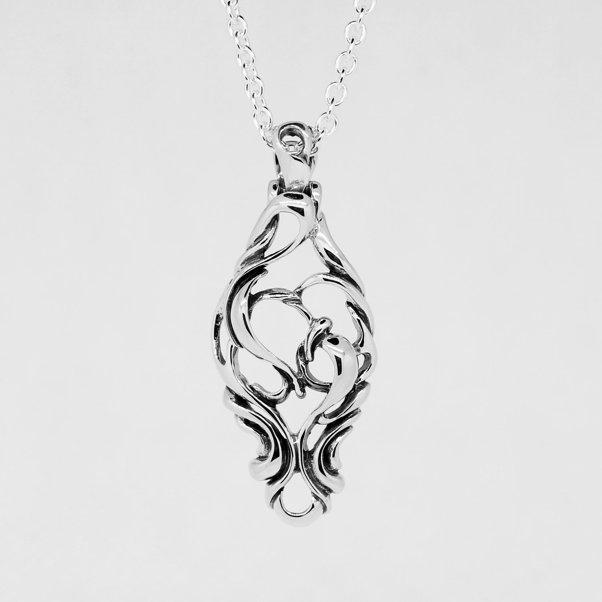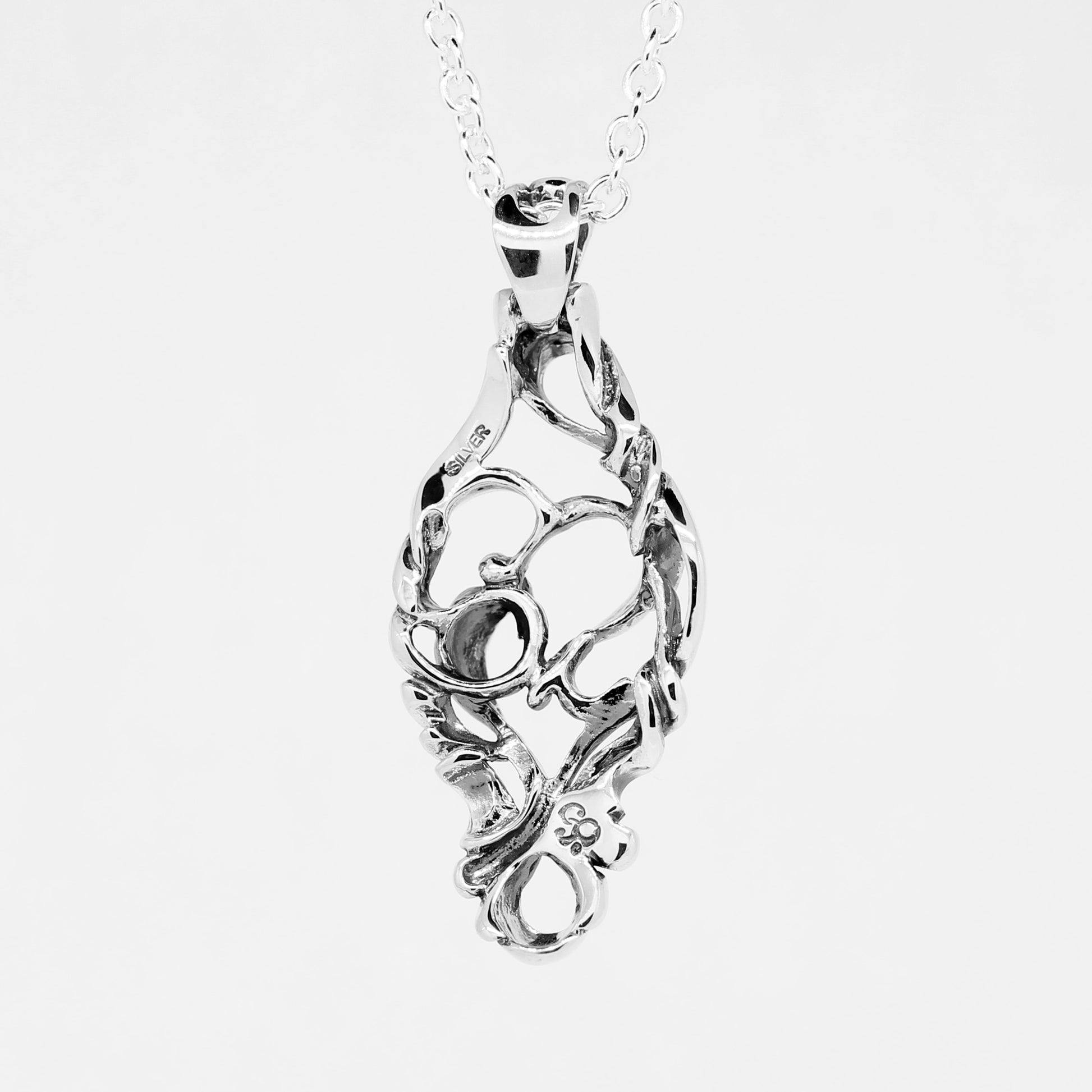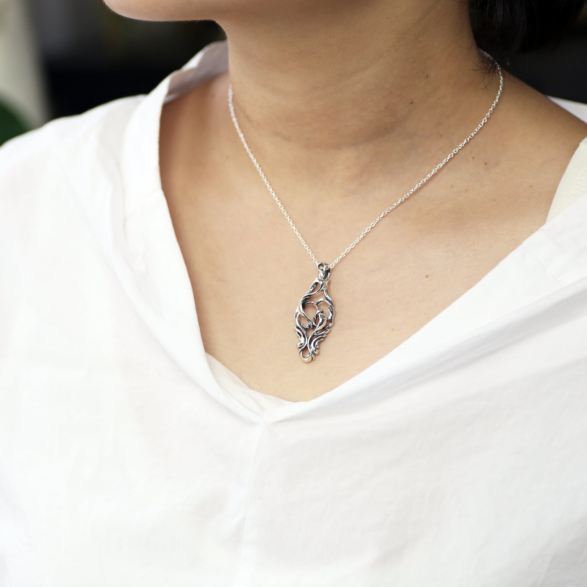 流れる曲線と透かしのデザインでハートを描くようなイメージで構築されたペンダント。