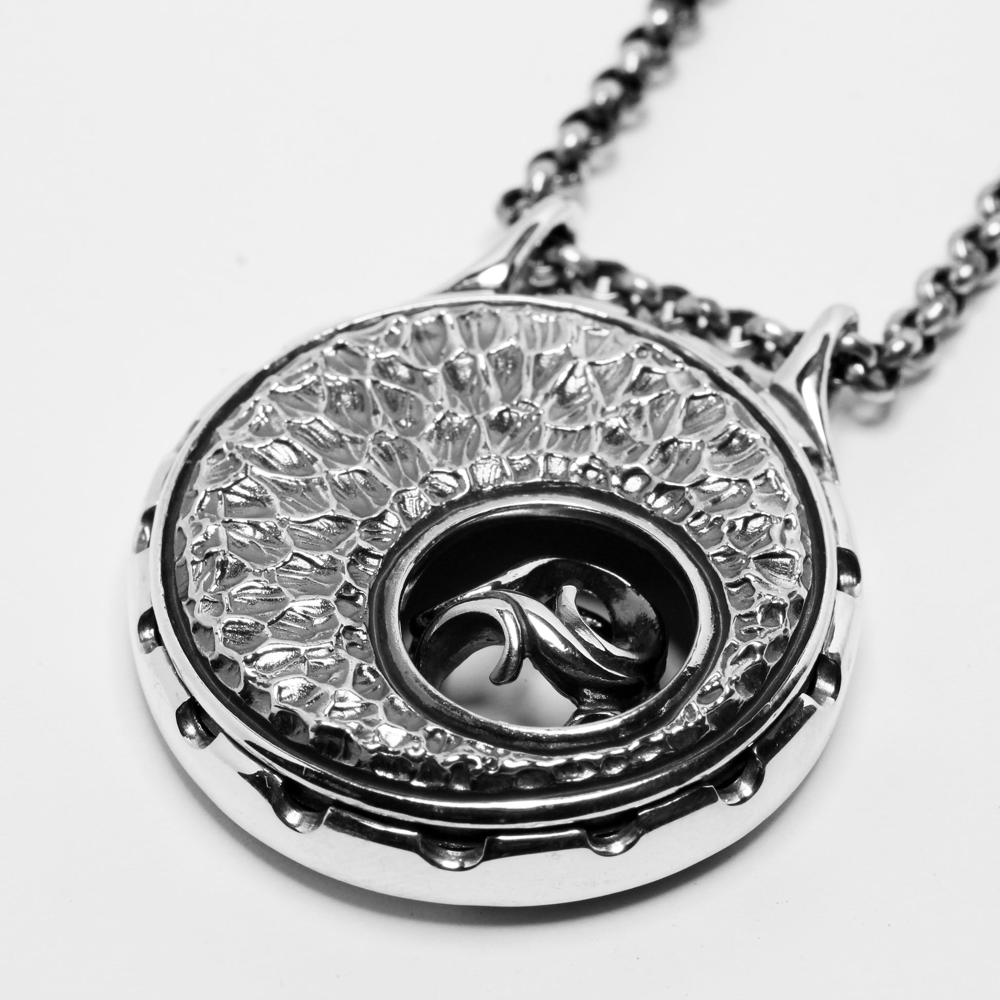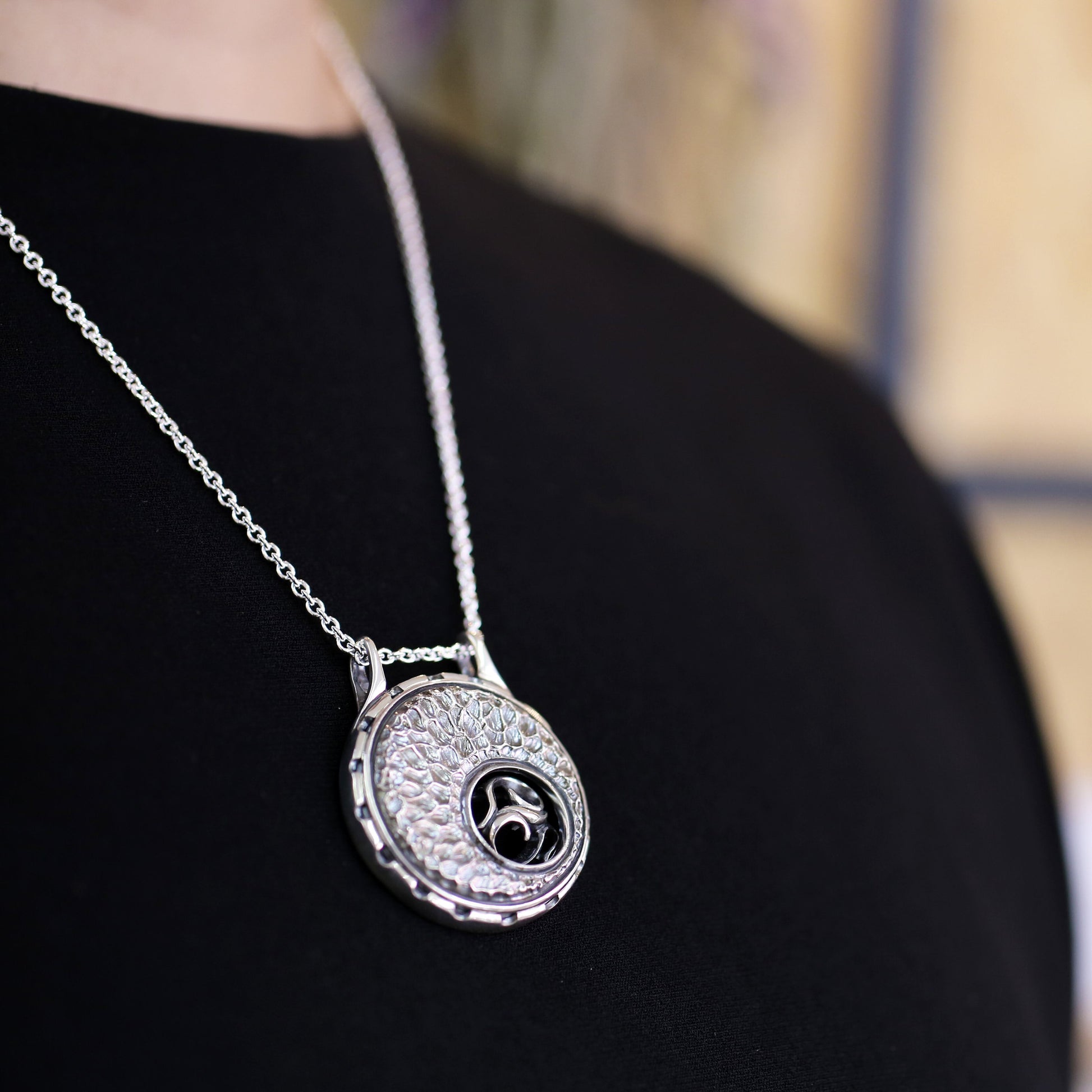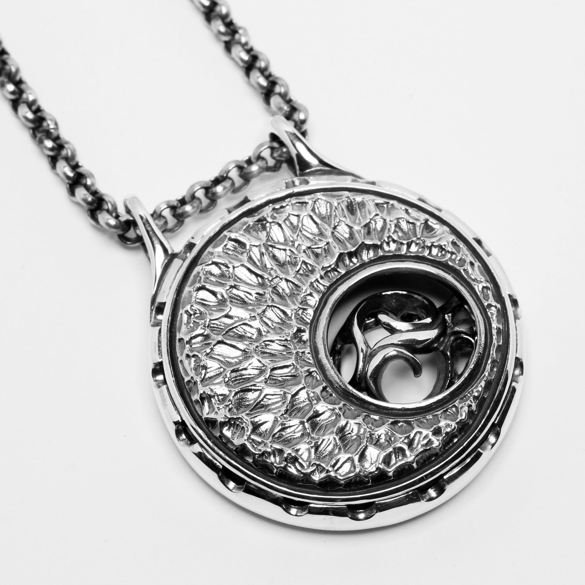 水面をイメージした平面的なパーツの中から、曲線の輝きがあふれ出るような臨場感を見せるペンダント。