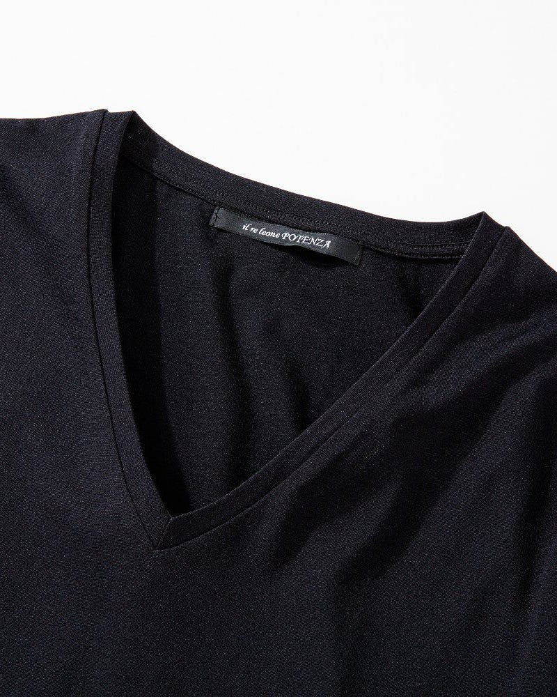 天幅広く、前下がりもやや深く設定したVネックは、マスキュリンな力強さに艶やかさが共存するような品のある開き具合。ベーシックな無地のVネックTシャツながら、上質な素材を使いアウターをより強く引き立てるインナーカットソーに仕上げています。